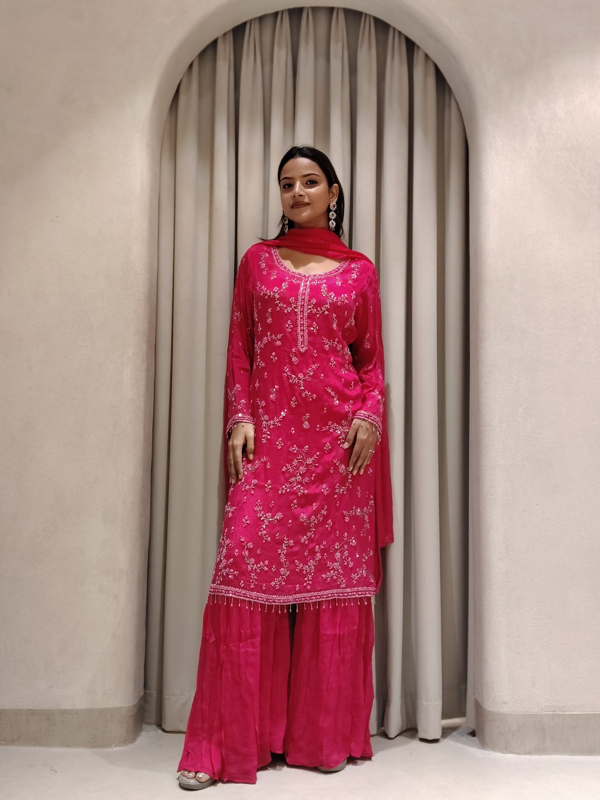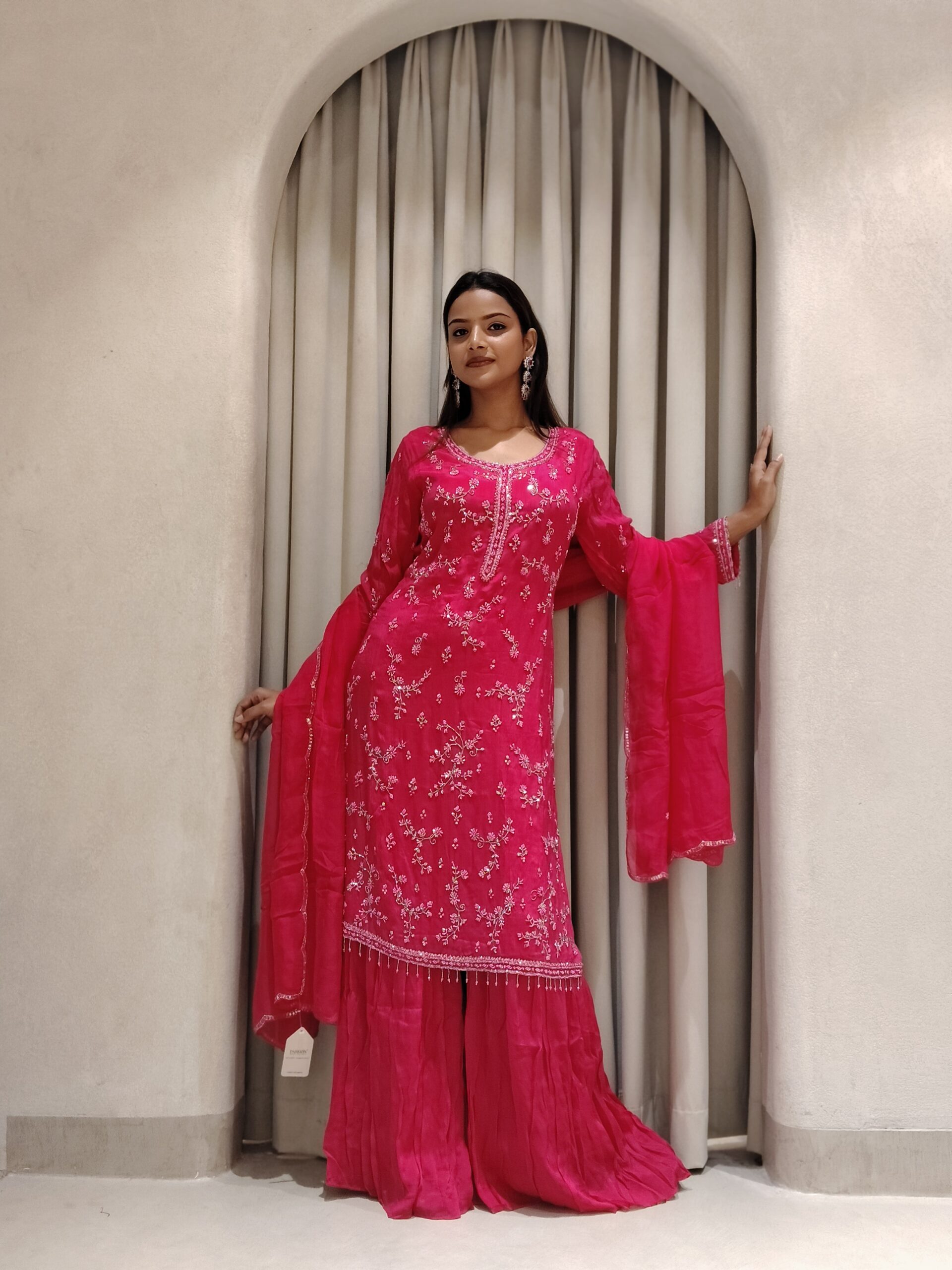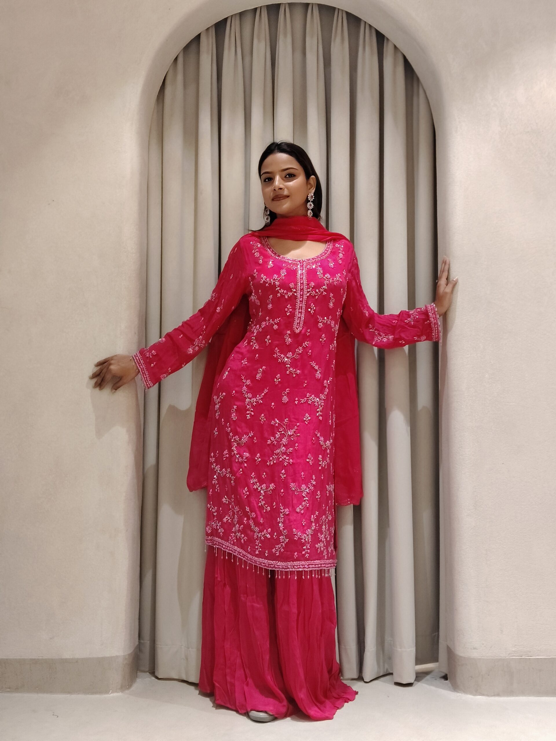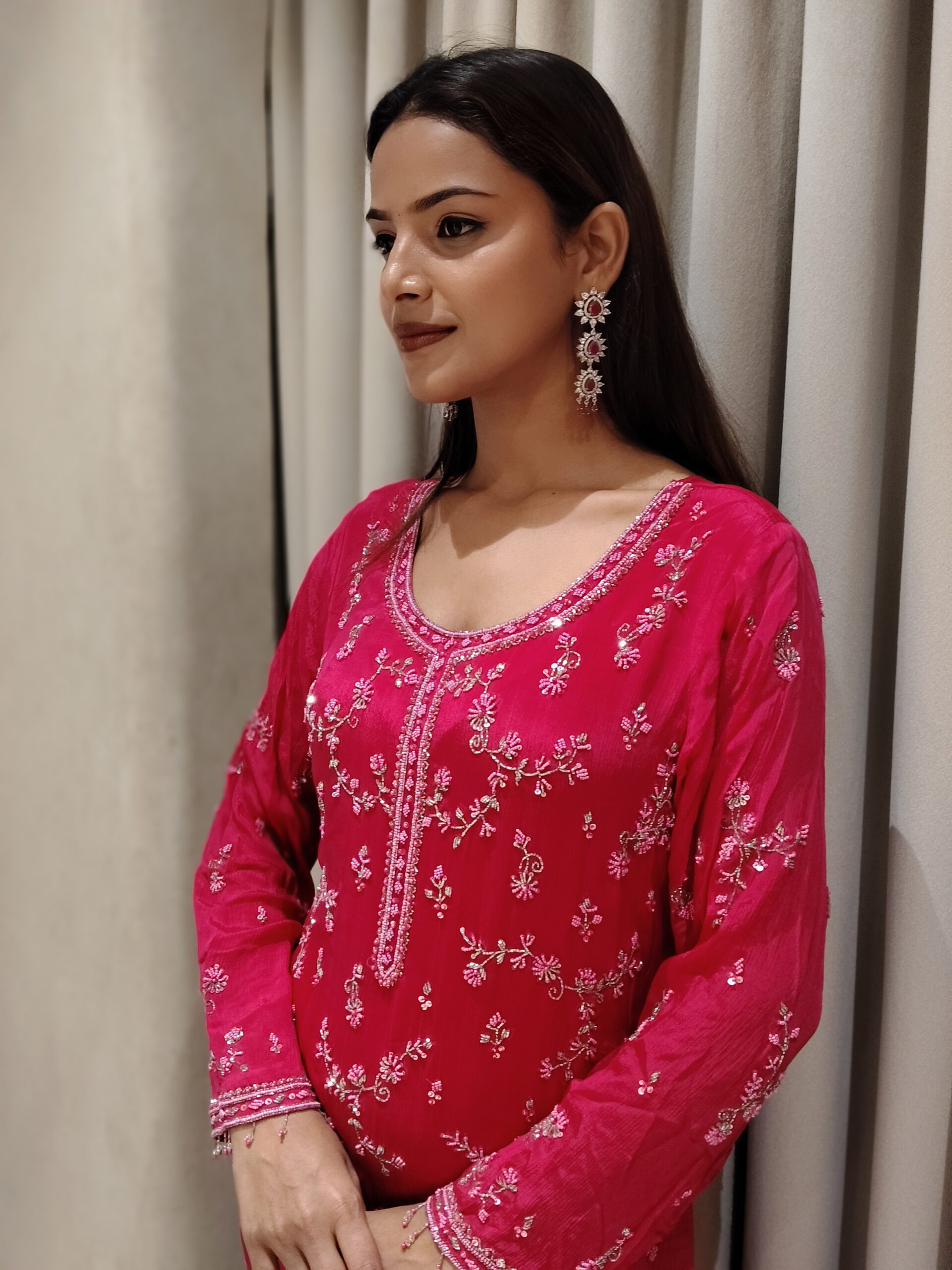 A beautiful pink outfit adorned with exquisite moti and cutdana handwork, making it the perfect attire for weddings and grand celebrations.