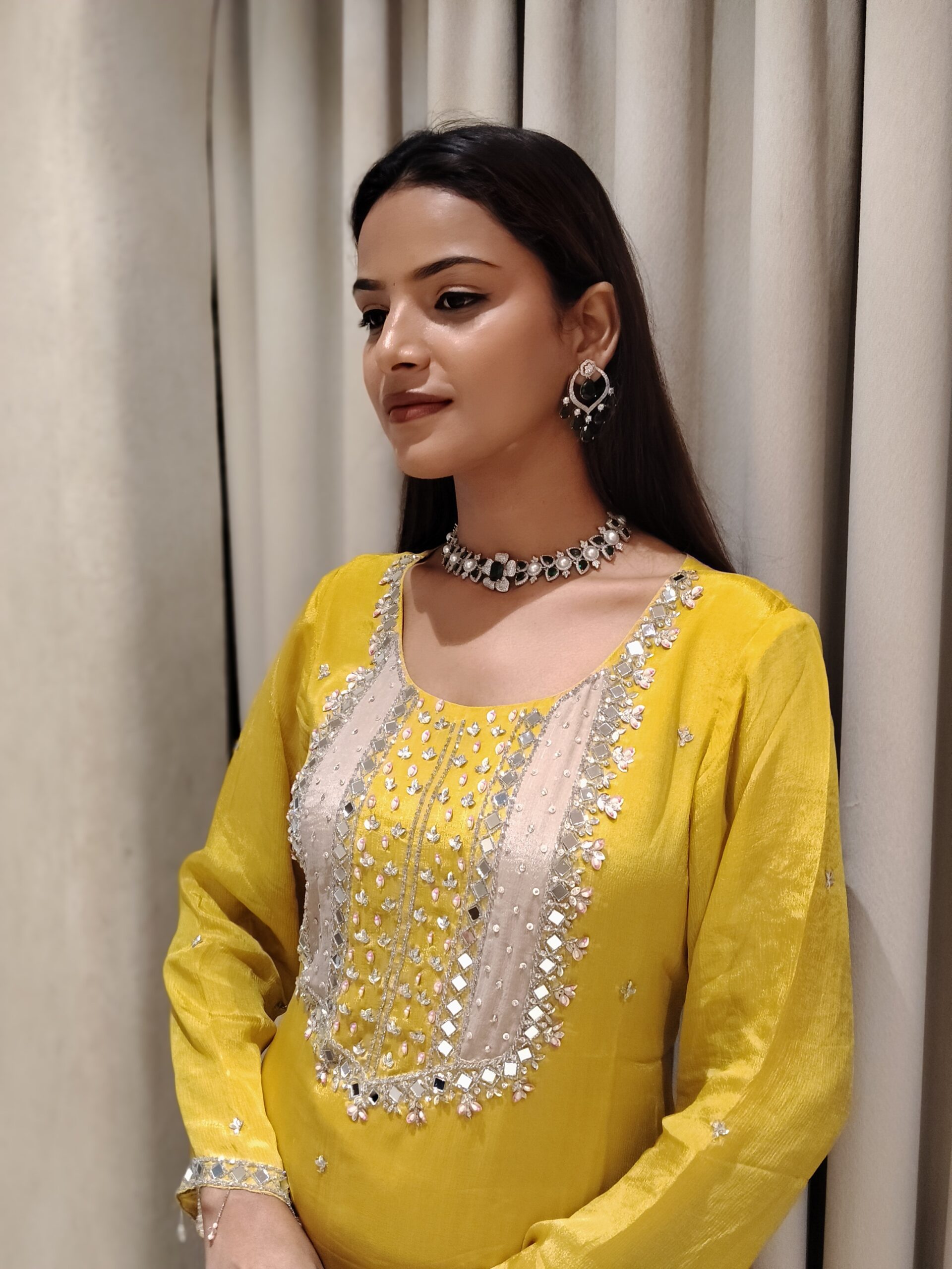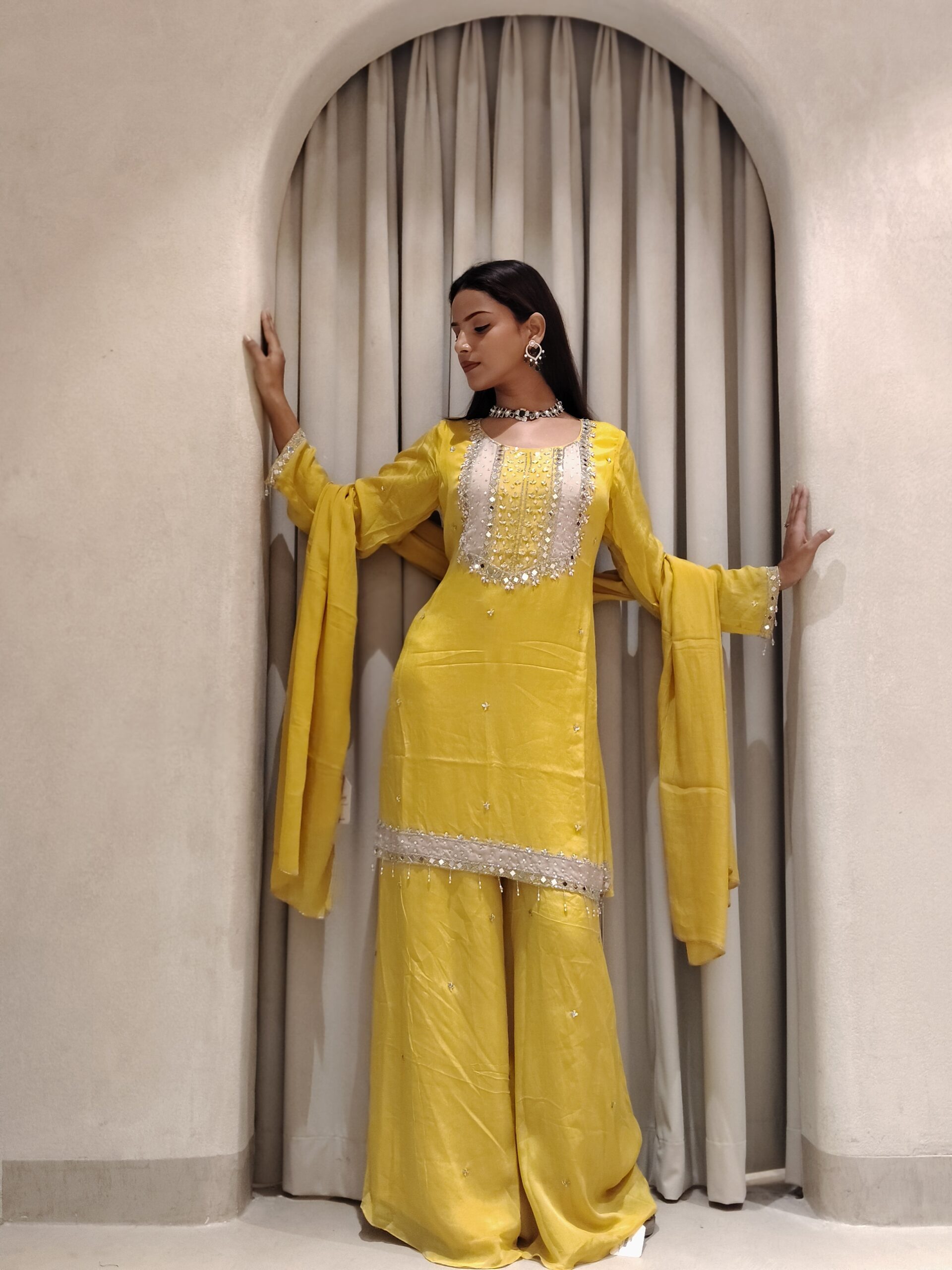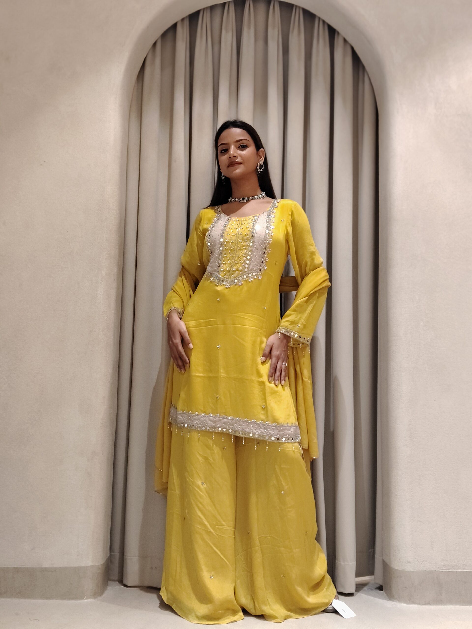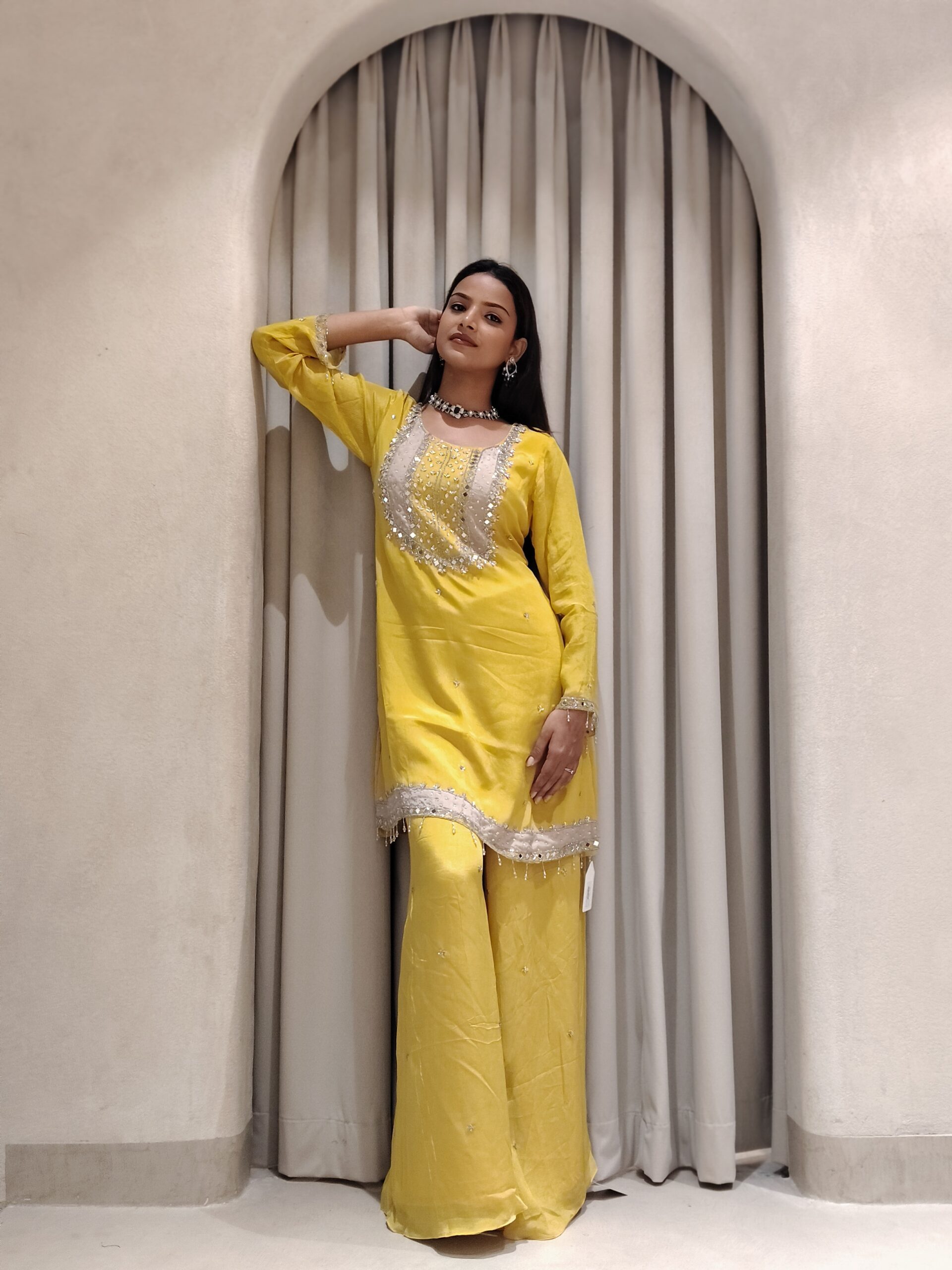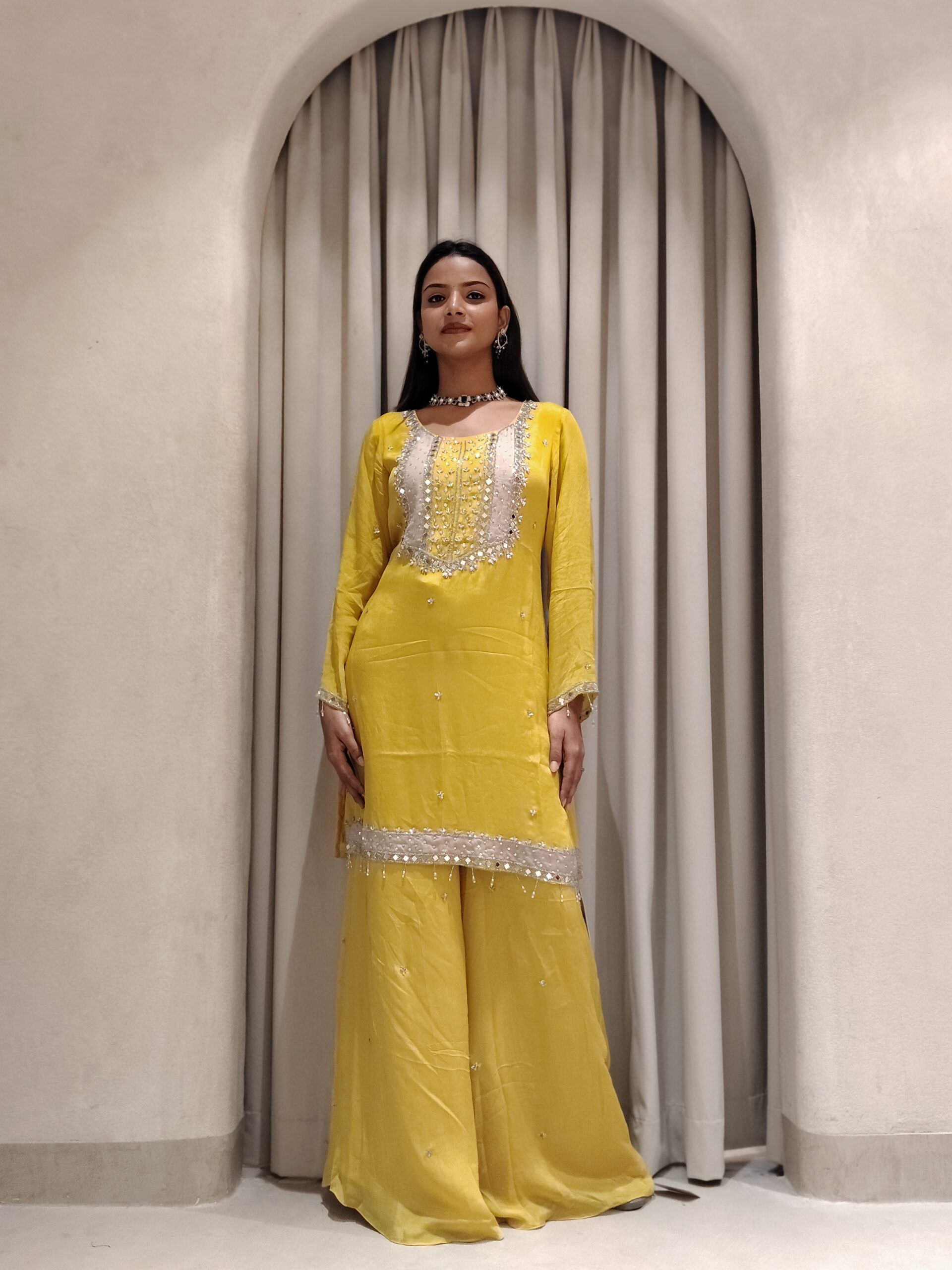 A stunning yellow Haldi outfit adorned with intricate mirror, cutdana, stone, and bead work, radiating festive elegance and joyful charm.