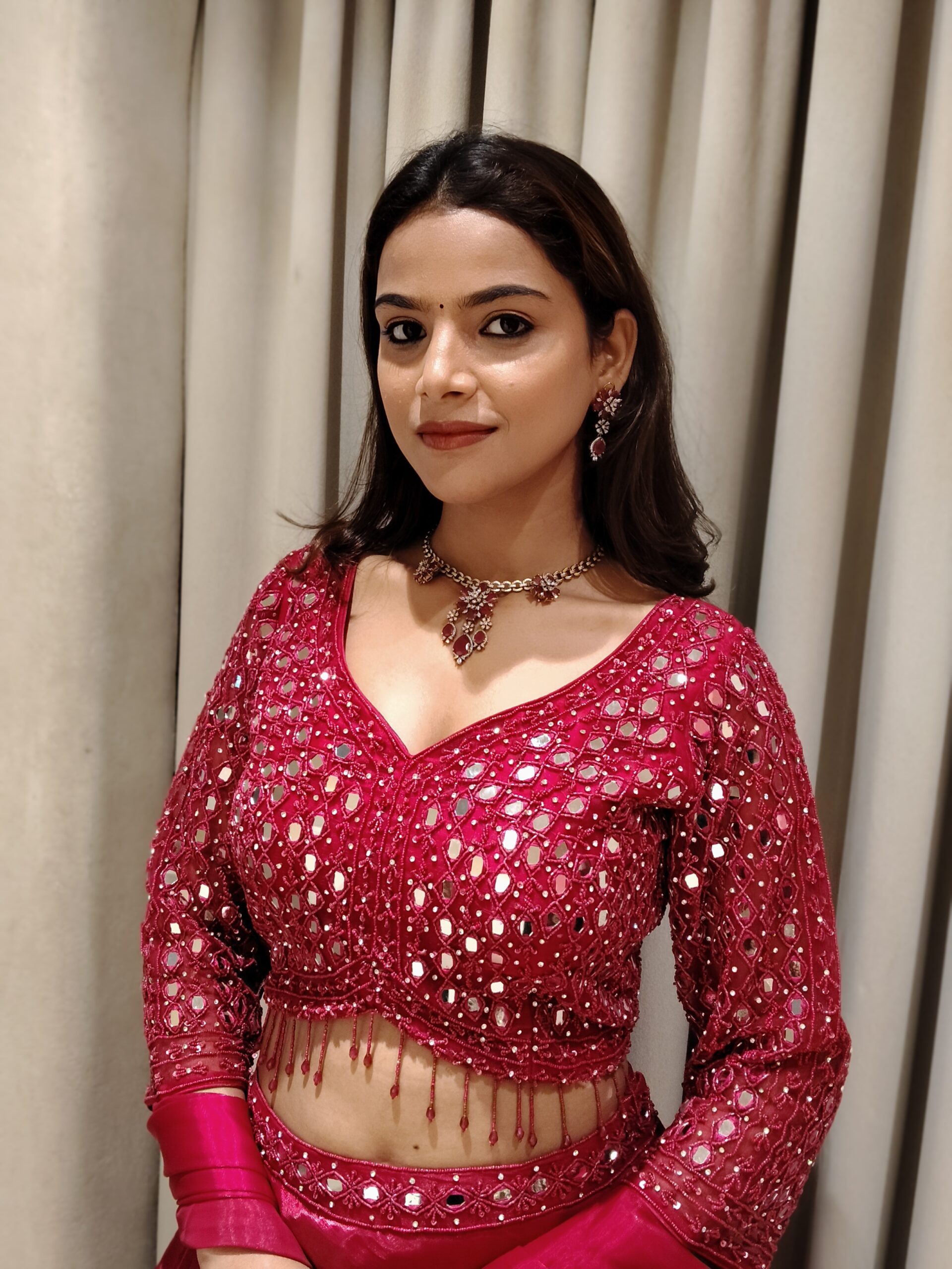 The blouse is exquisitely adorned with intricate full handwork, featuring luminous pearls, finely detailed cutdana, and delicate mirror embellishments that reflect light with every movement. Designed with full hand sleeves, it adds a regal charm and timeless grace, blending tradition with contemporary finesse.