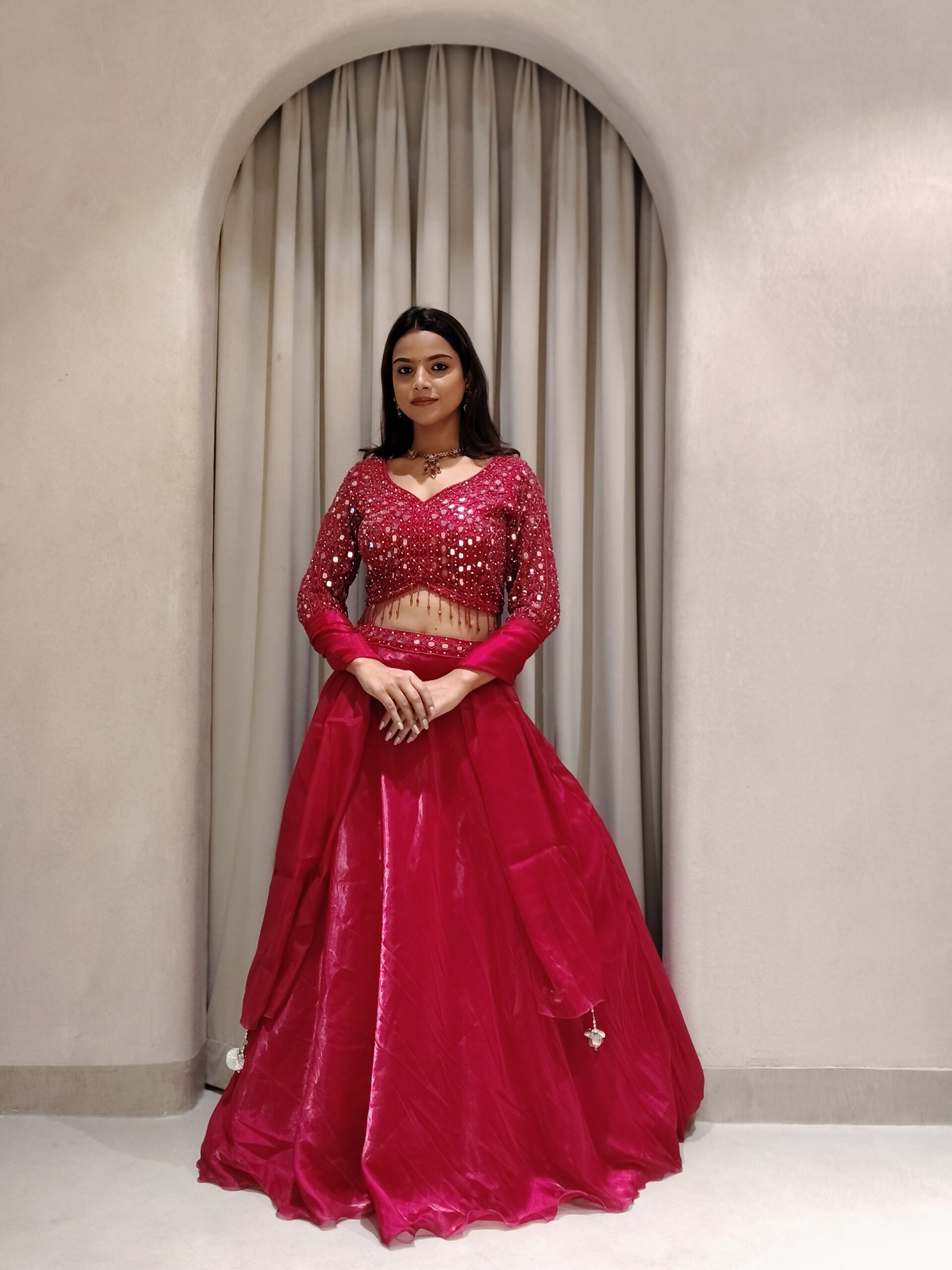 A vision of soft sophistication, this enchanting pink lehenga is crafted in luxurious Jimmu Chu fabric, celebrated for its graceful fall and subtle sheen. The plain, flowing skirt creates a refined canvas of elegance, allowing the artistry of the blouse to truly shine.