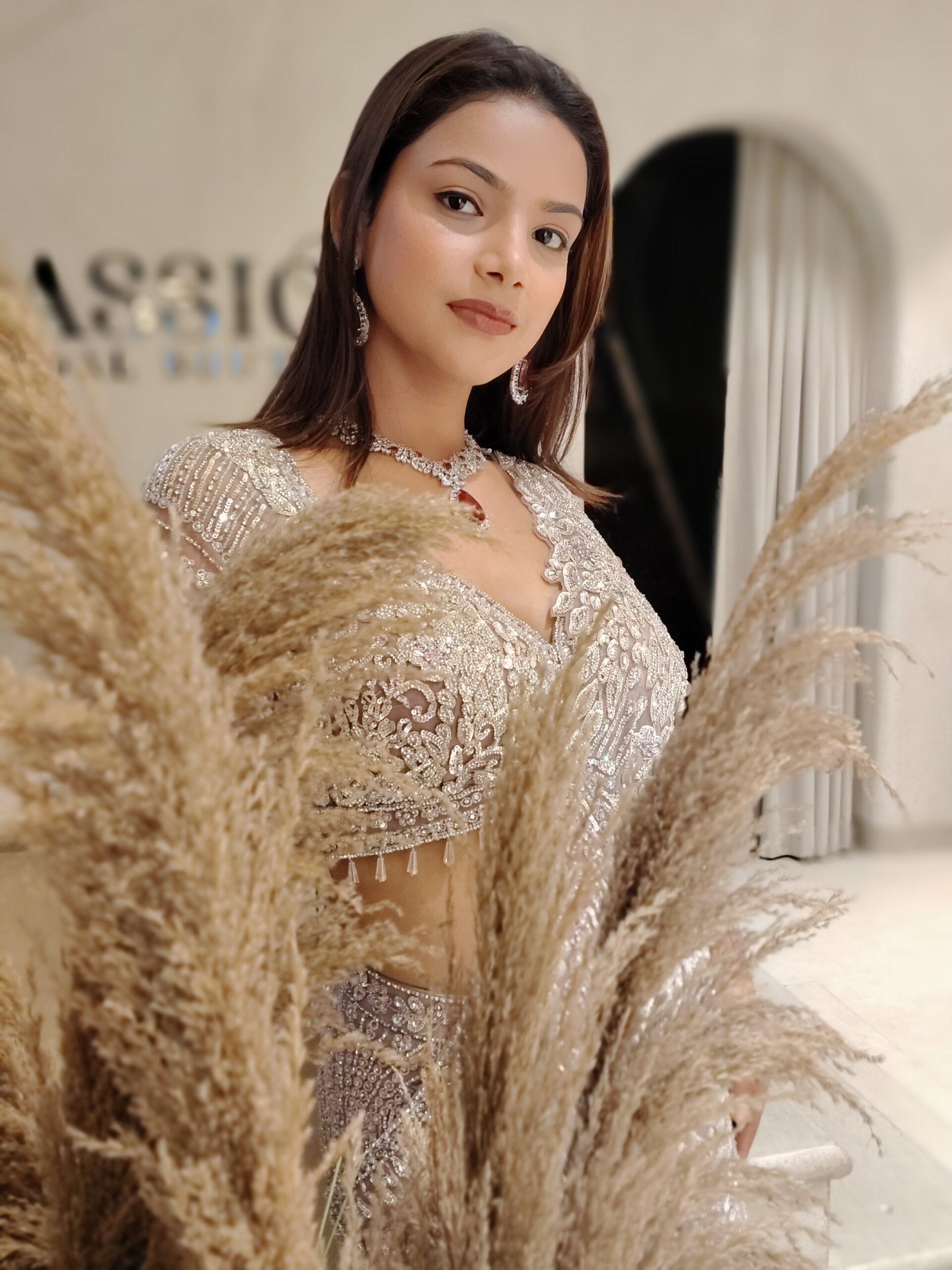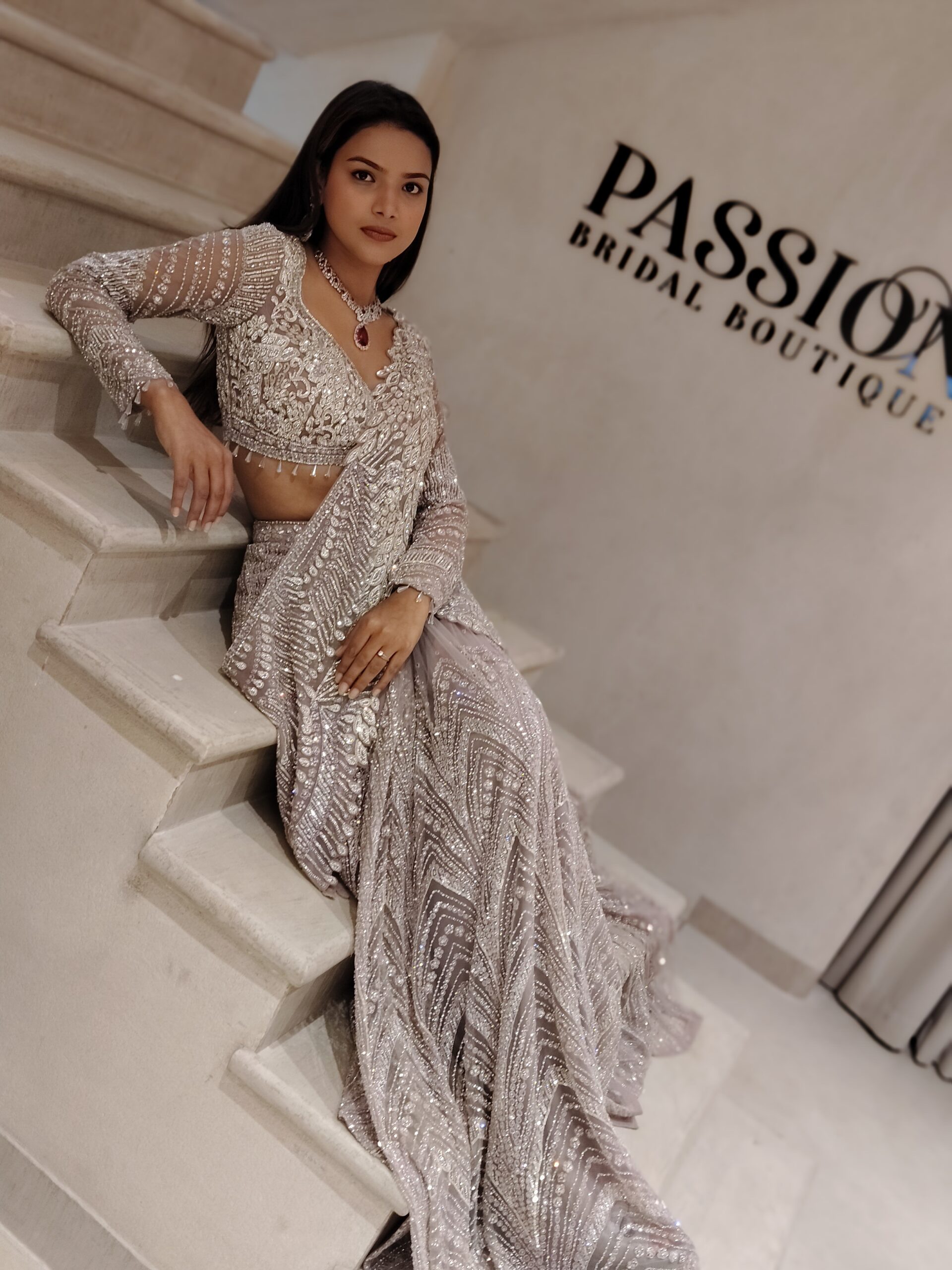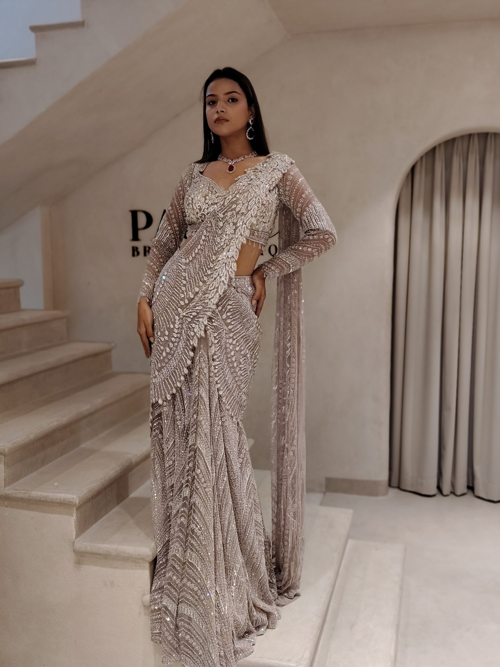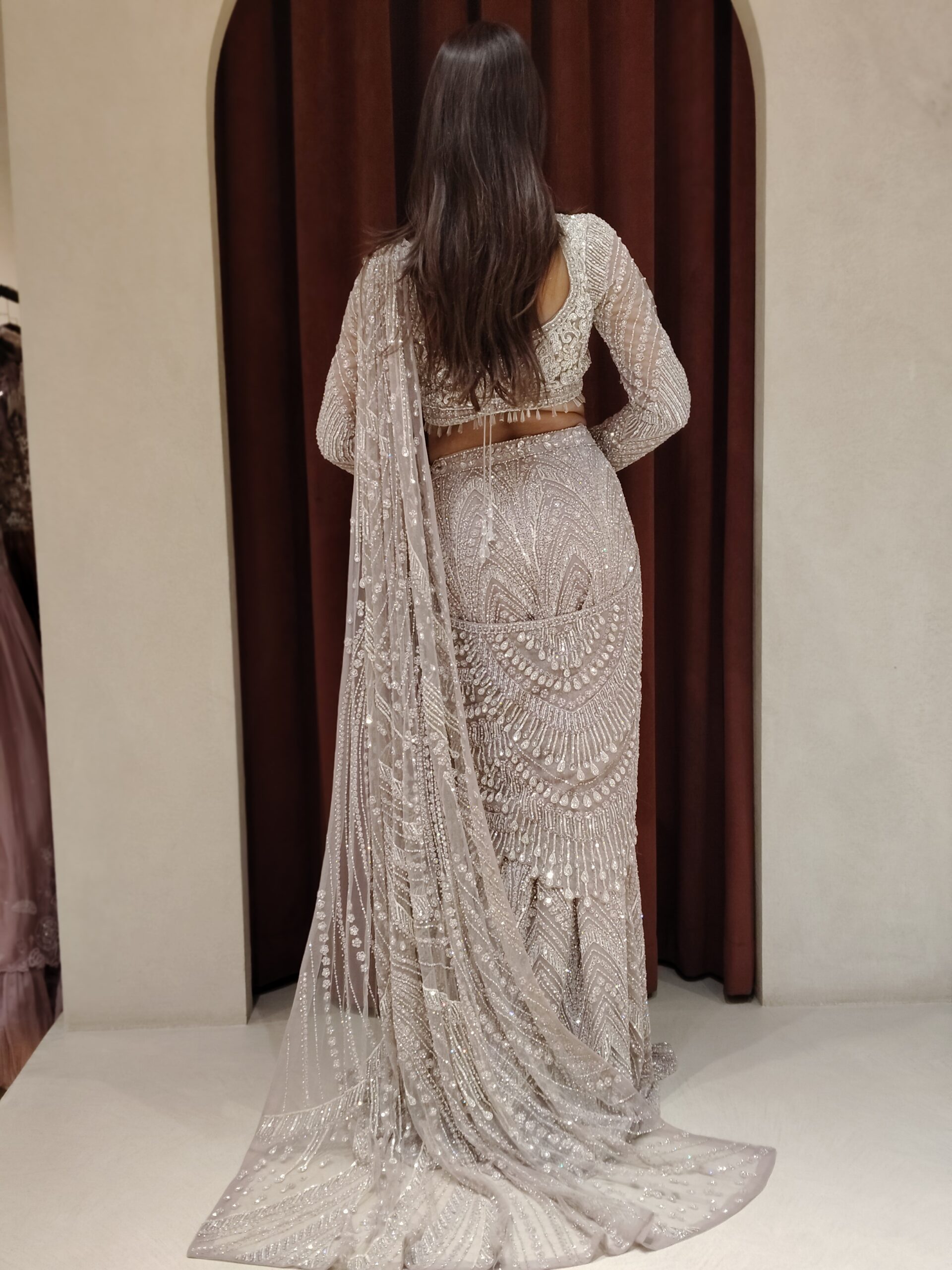 The saree is thoughtfully pre-draped to offer a flawless silhouette, embracing the bride with effortless grace while ensuring comfort through every cherished ritual. The hand-embroidered detailing cascades beautifully across the pallu and borders, creating a luminous play of sparkle under grand wedding lights.