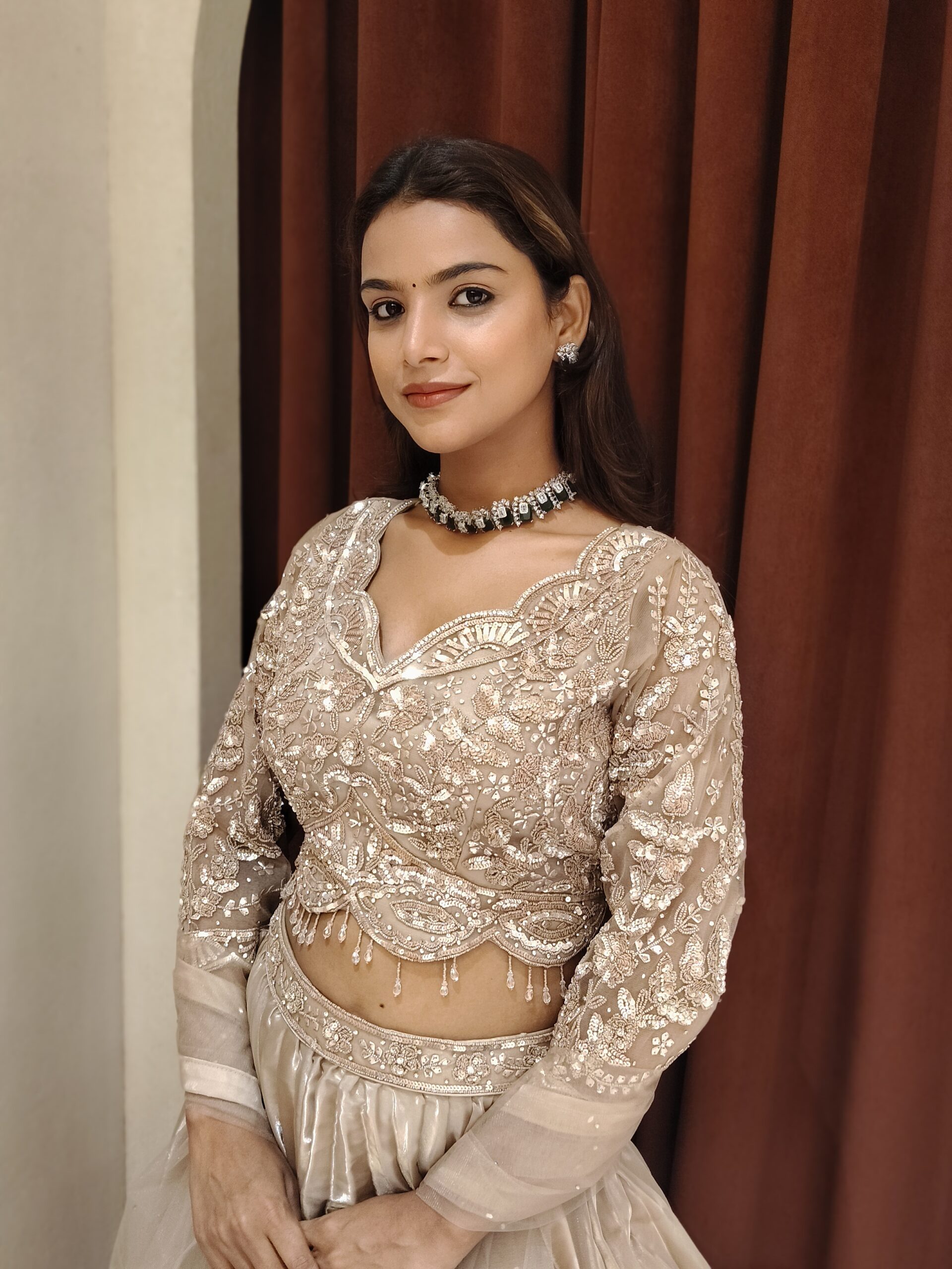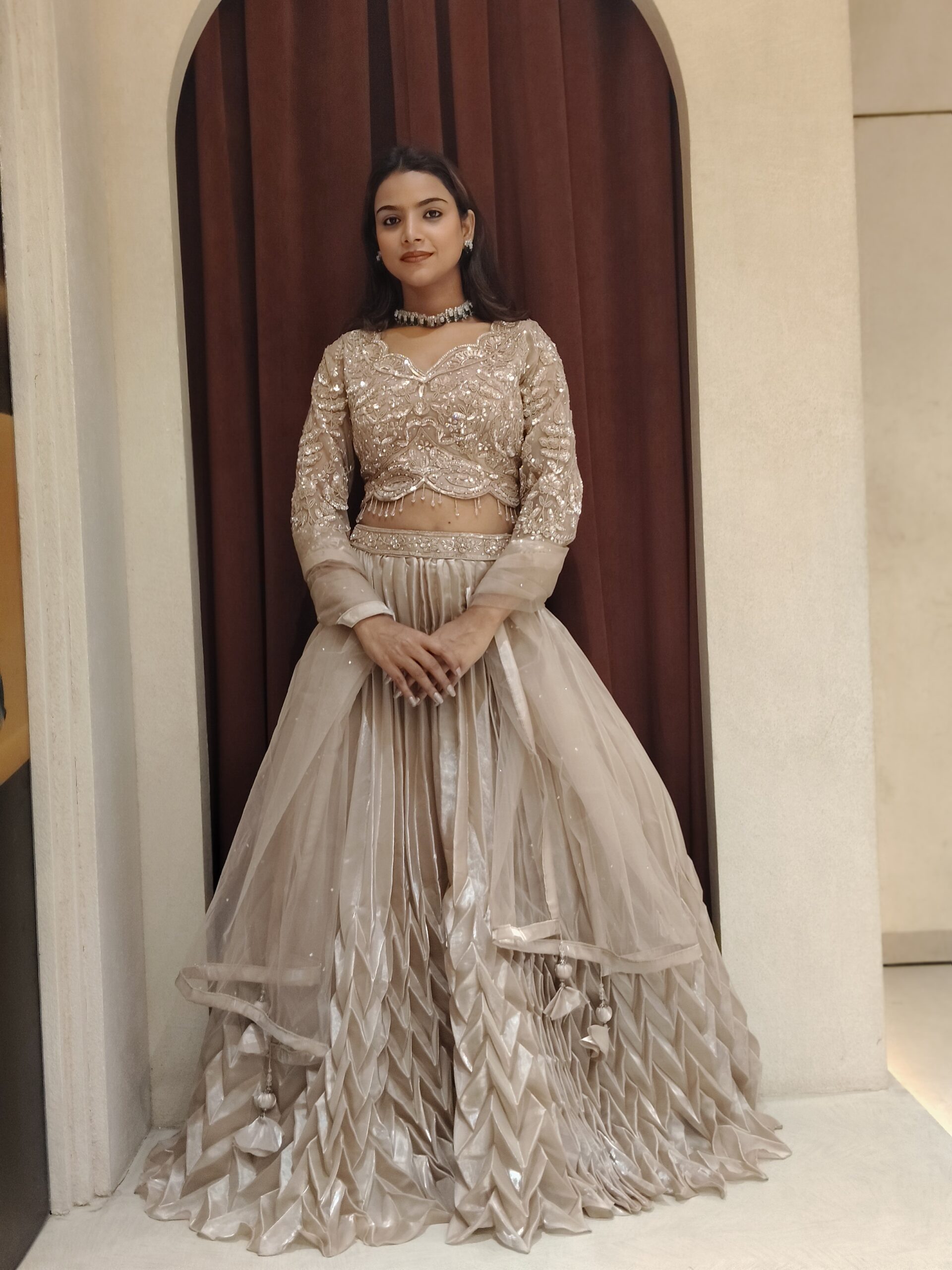 Champagne Gold Wrinkled Jimmy Choo Lehenga with Hand-Embellished Blouse