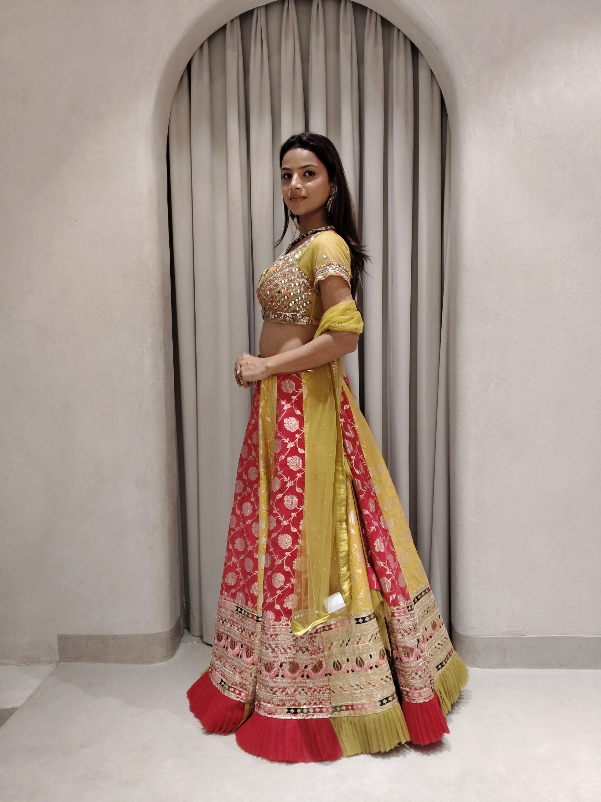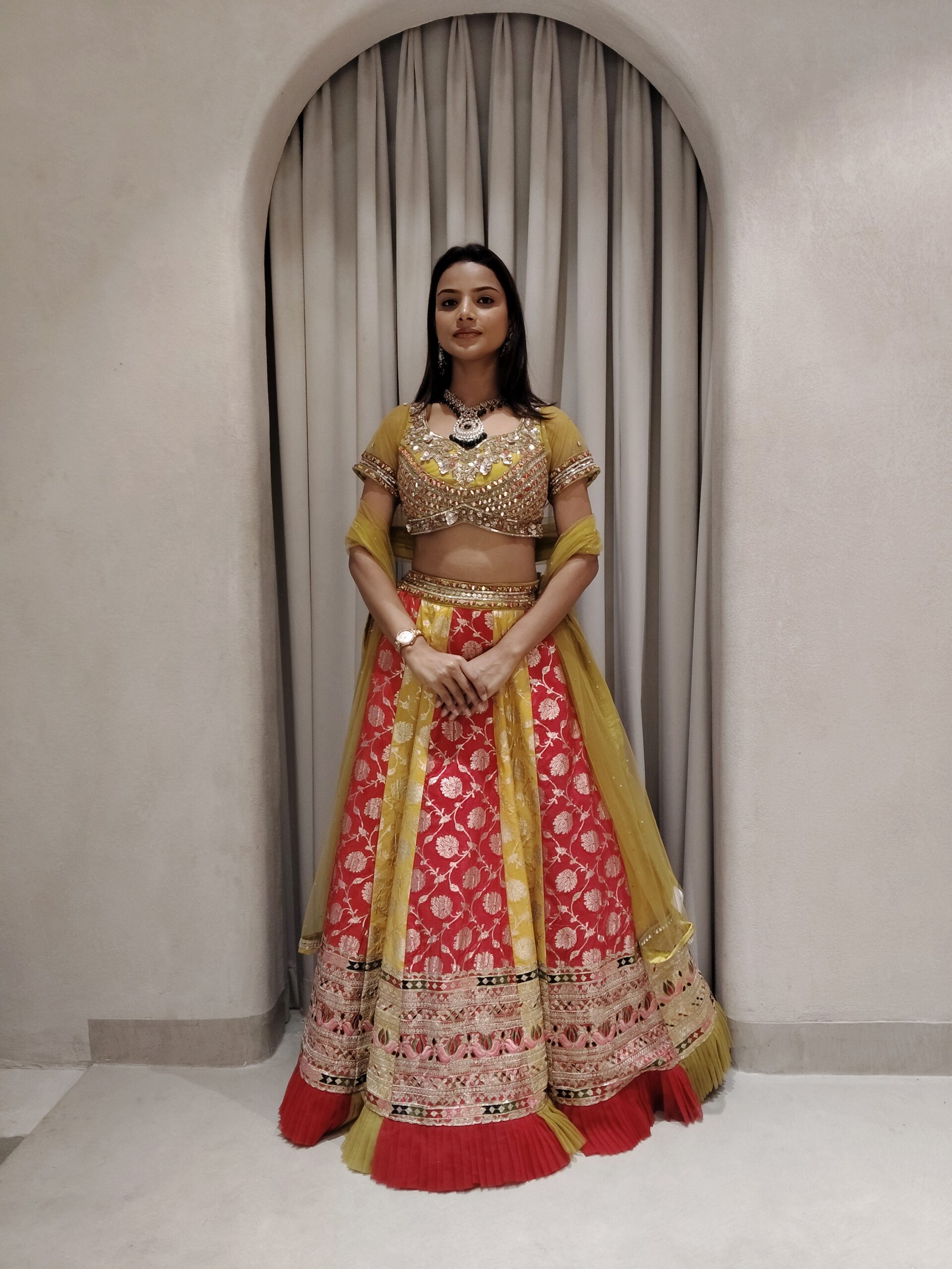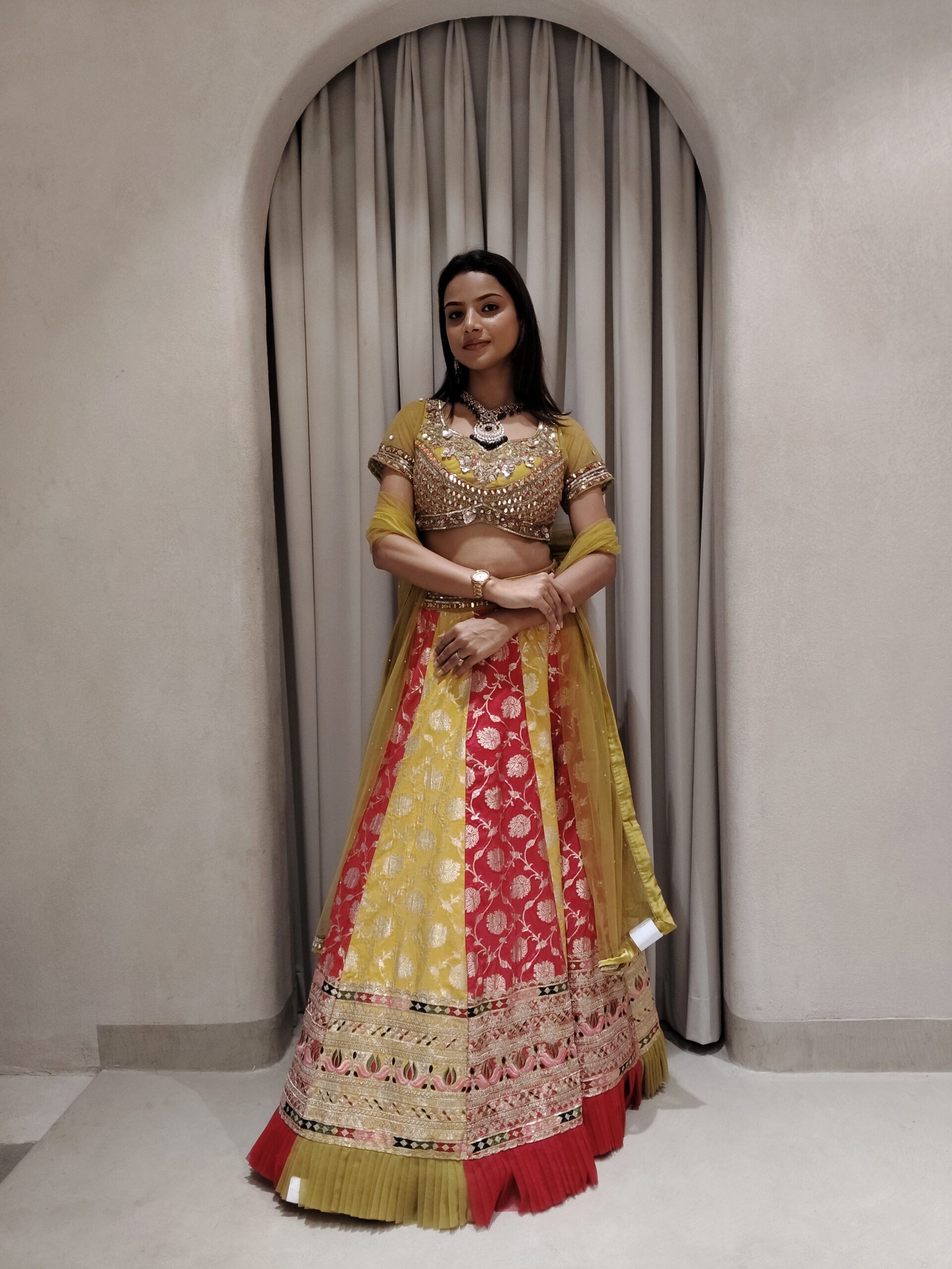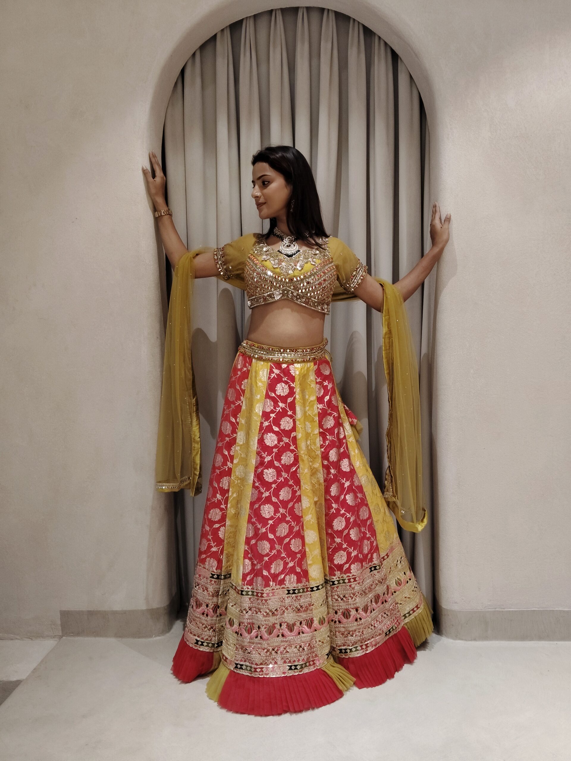 Embrace the vibrance of tradition with this exquisite red and yellow Banarasi crop top ensemble, designed to make a bold yet graceful statement. The richness of Banarasi weave reflects timeless heritage, while the harmonious blend of red and yellow hues evokes the warmth and splendor of grand celebrations.