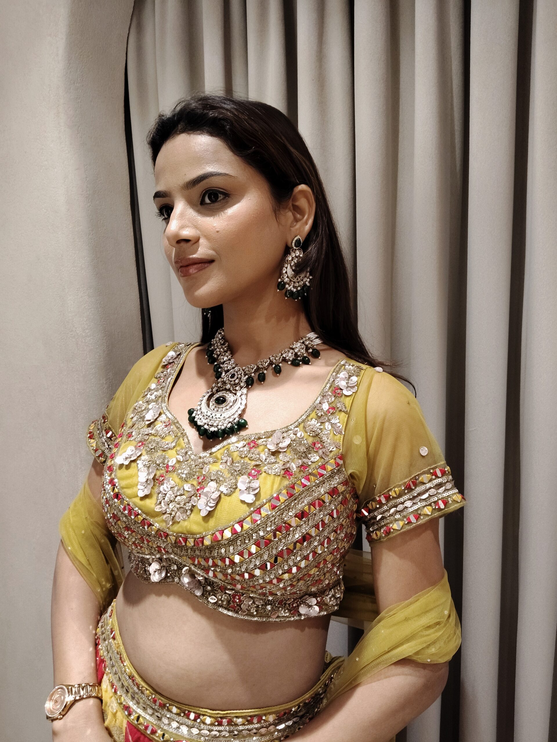 Paired with a soft net dupatta that drapes with ethereal elegance, this ensemble strikes the perfect balance between regal tradition and contemporary glamour. Ideal for weddings, haldi ceremonies, festive occasions, and celebratory evenings, this creation embodies sophistication, vibrance, and unforgettable luxury.