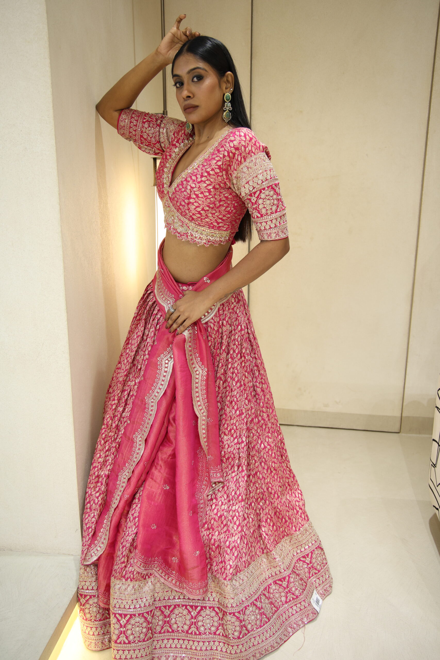 Step into timeless elegance with this exquisite Pink Banarasi Lehenga, a true celebration of heritage craftsmanship and modern luxury. Woven from the finest Banarasi silk, the lehenga radiates a soft, regal sheen in a captivating blush-pink hue—perfect for making a graceful yet striking statement.