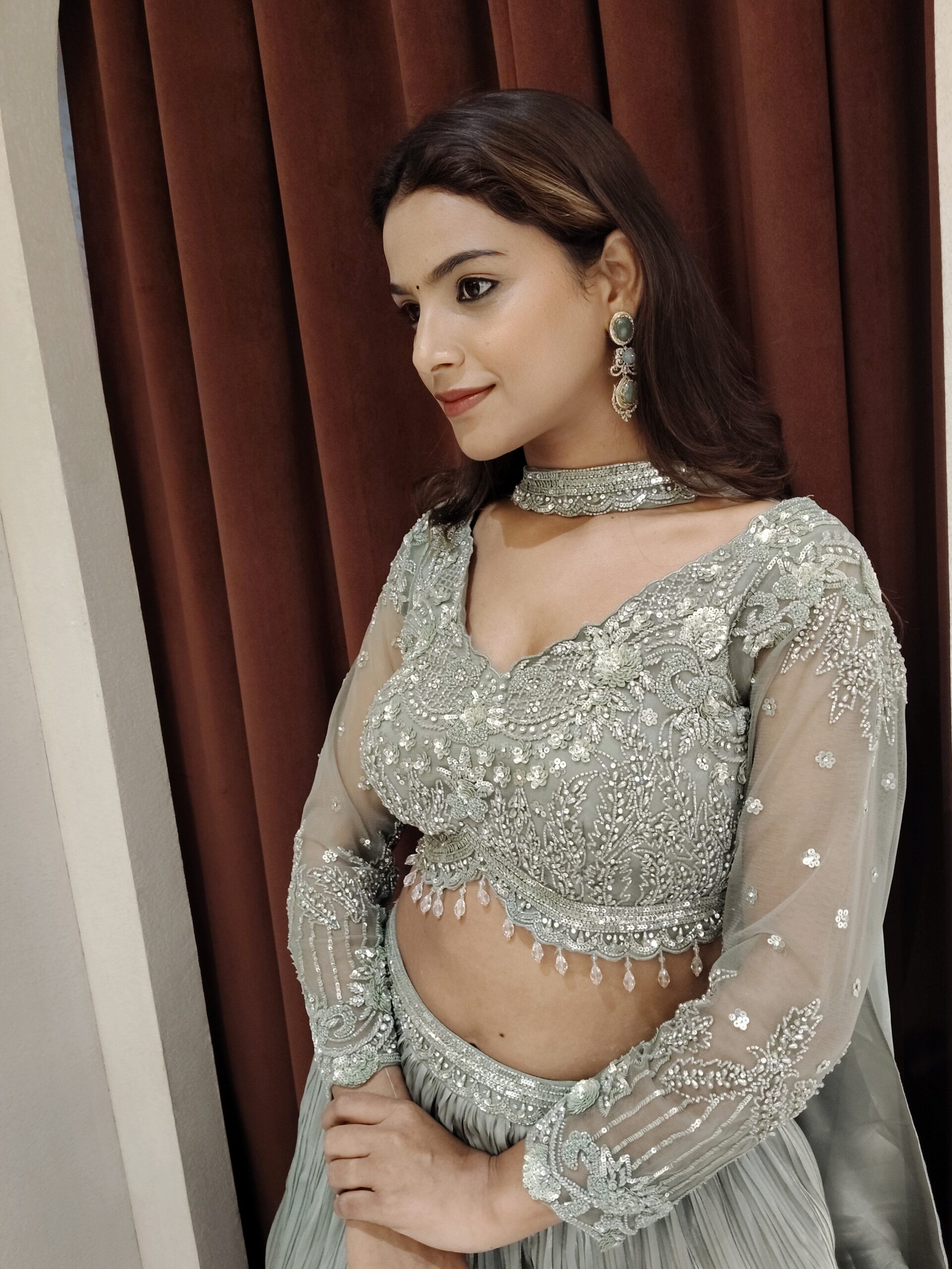 Paired with a fully hand-embellished blouse, this ensemble is a celebration of master craftsmanship. Intricately adorned with shimmering sequins, delicate cutdana work, and precision-set stones, every detail is thoughtfully placed to create a radiant, multidimensional sparkle. The artistry captures light beautifully, ensuring you shine with refined brilliance at every step.