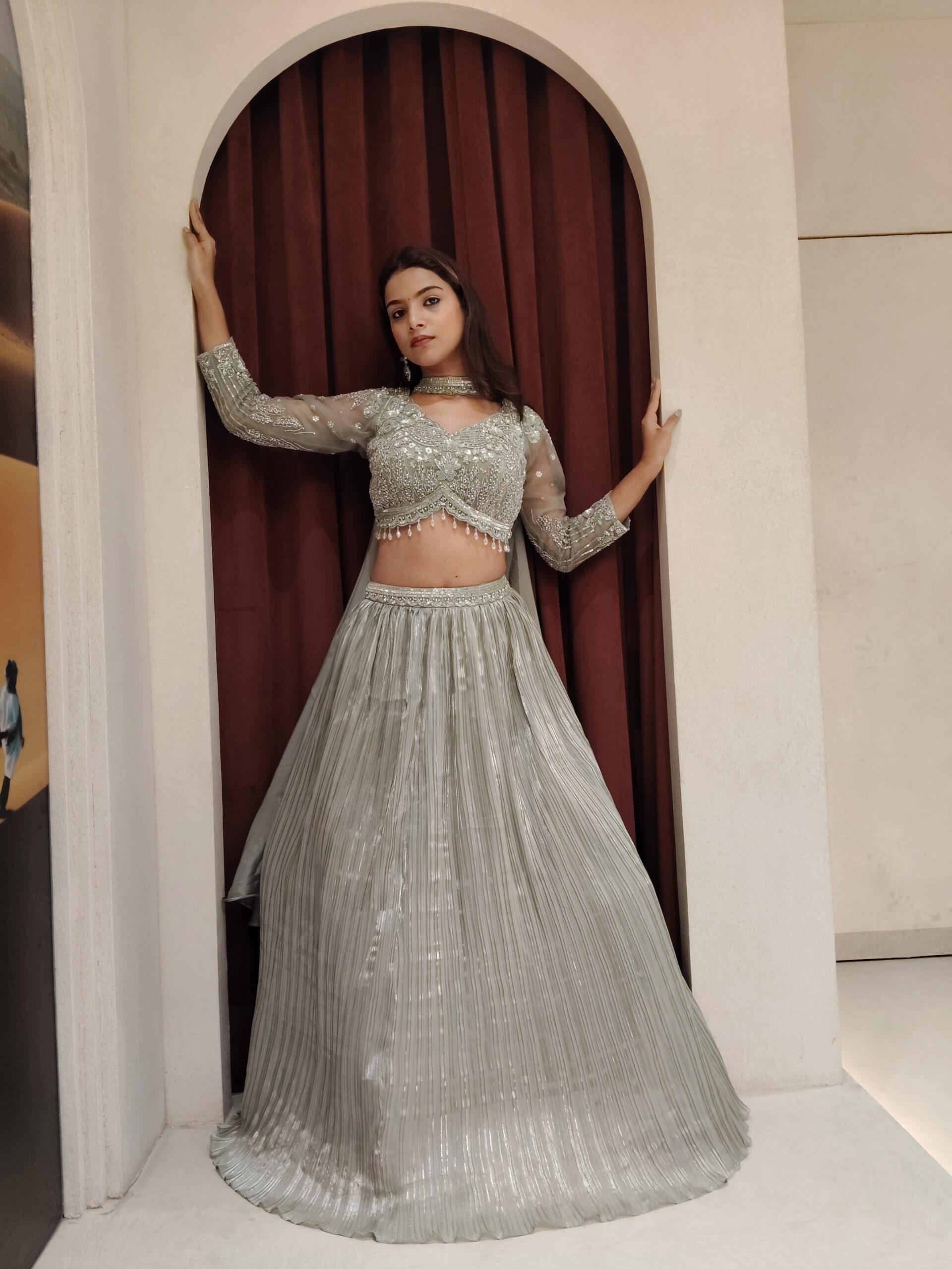 Indulge in couture-inspired opulence with this breathtaking Jimmy Choo crush fabric lehenga, designed for the woman who commands attention with effortless grace. The luxurious crush texture lends a fluid, light-reflective finish, creating a silhouette that moves with poetic elegance.