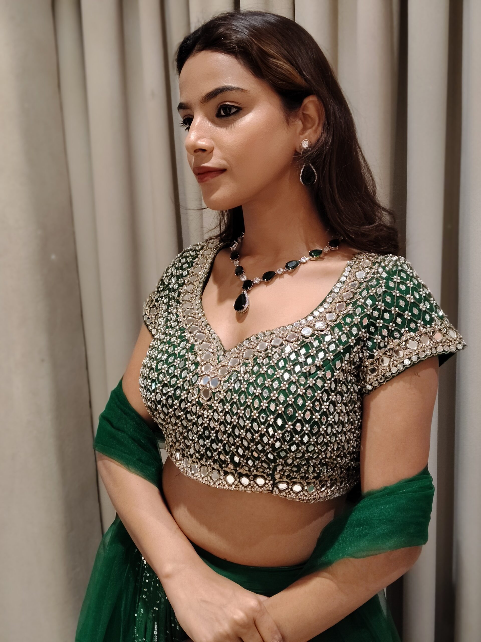 Bottle Green Sequin Lehenga with Handcrafted Pearl & Mirror Work Blouse