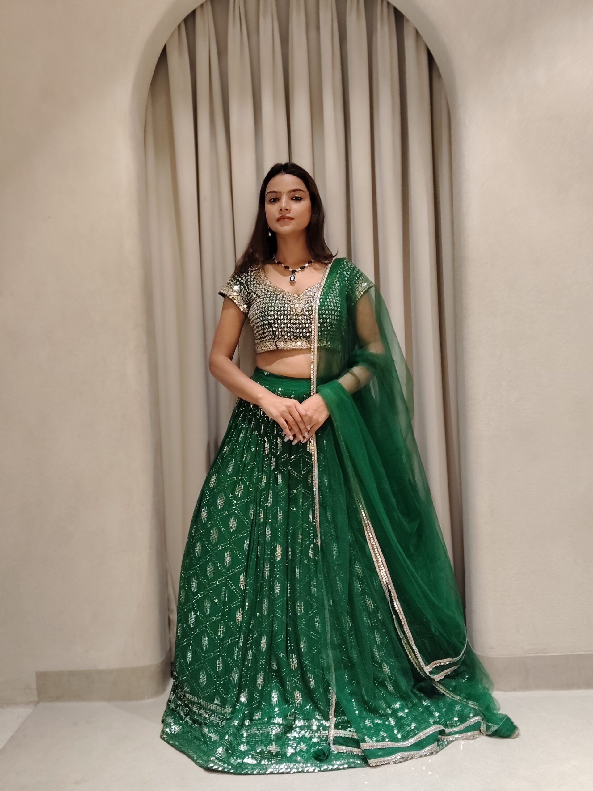 Immerse yourself in regal sophistication with this enchanting bottle green lehenga, crafted in luminous sequin fabric that glistens with every graceful movement. The rich, jewel-toned hue evokes timeless opulence, while the fluid silhouette creates a striking yet effortlessly elegant presence.
