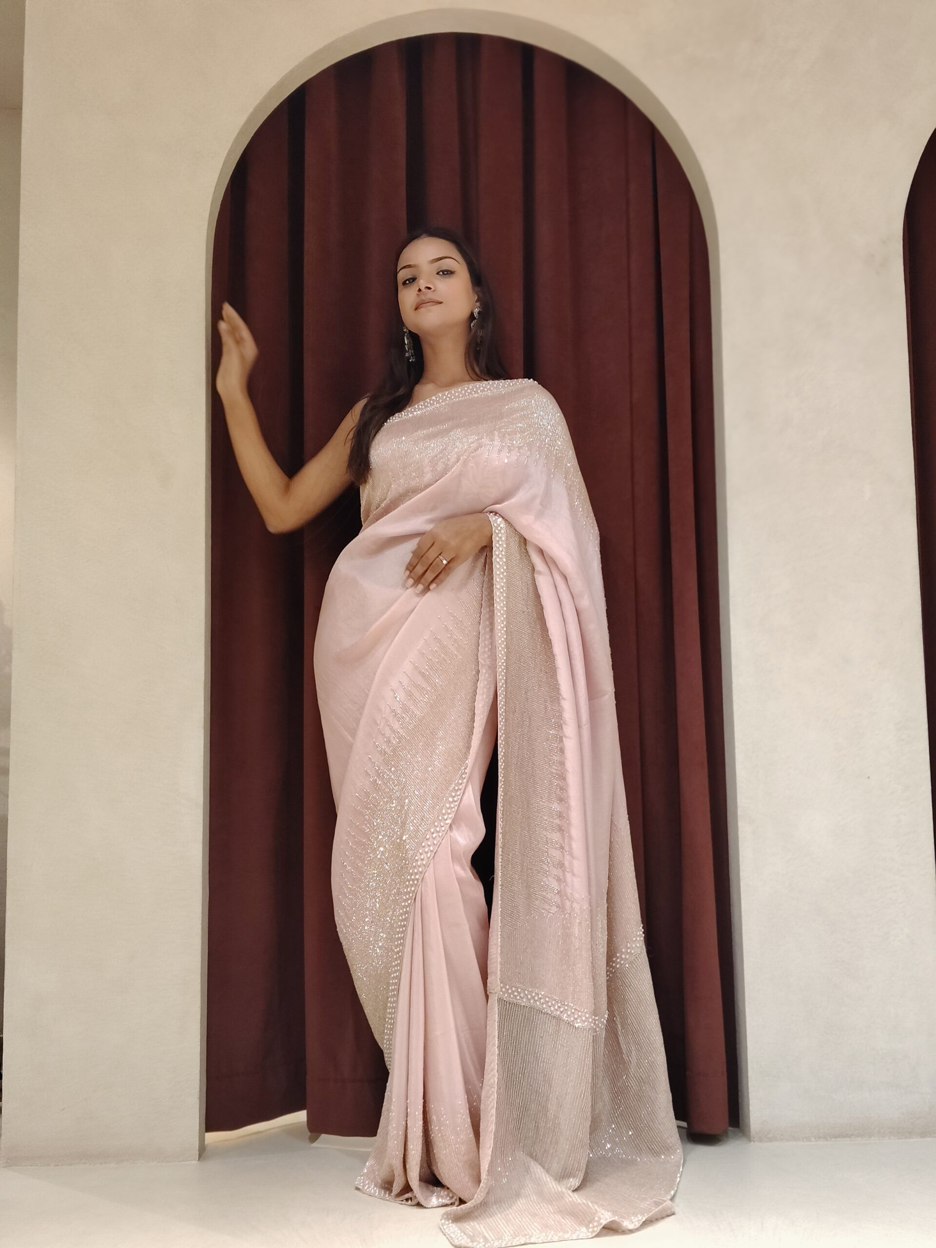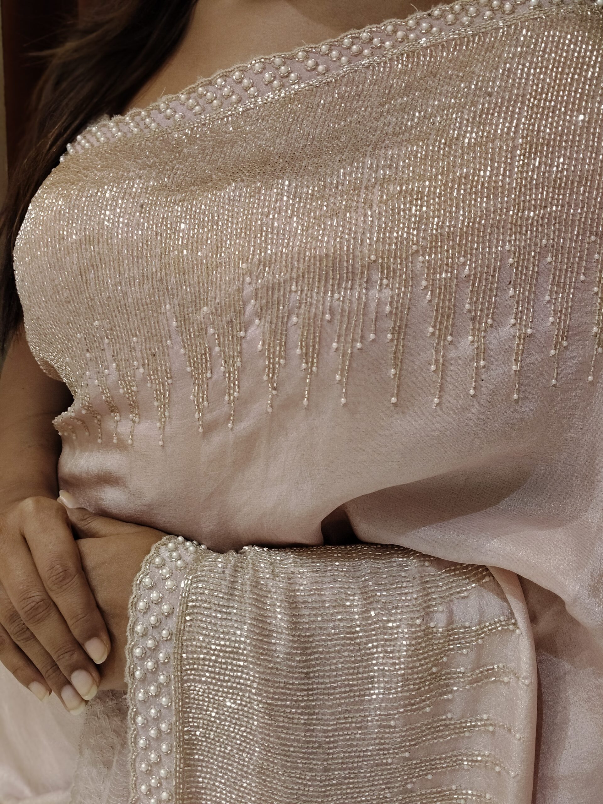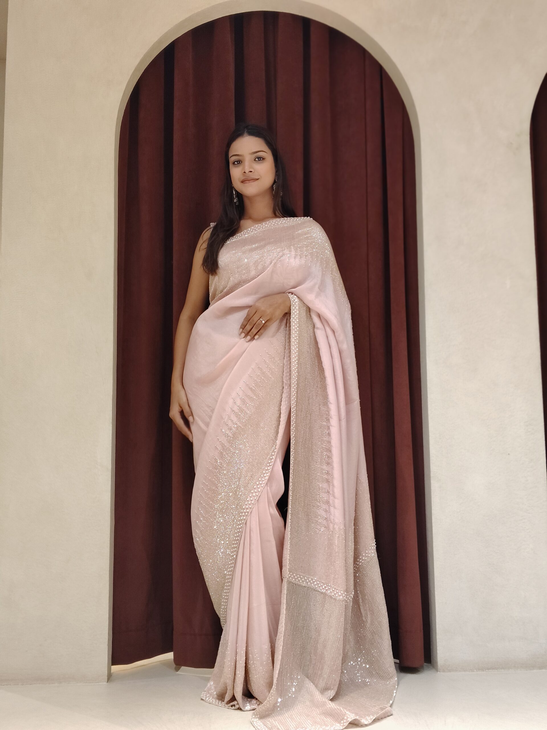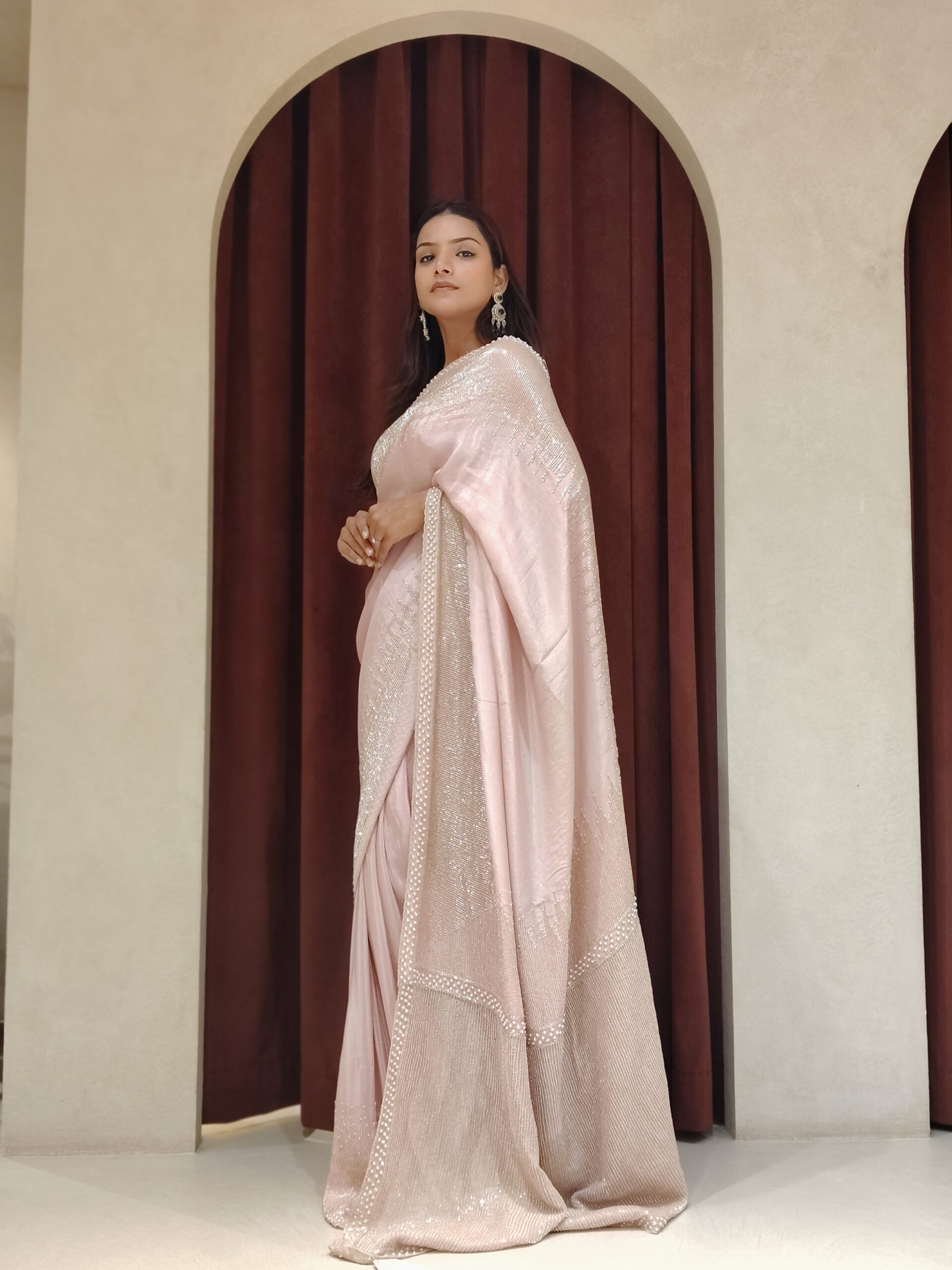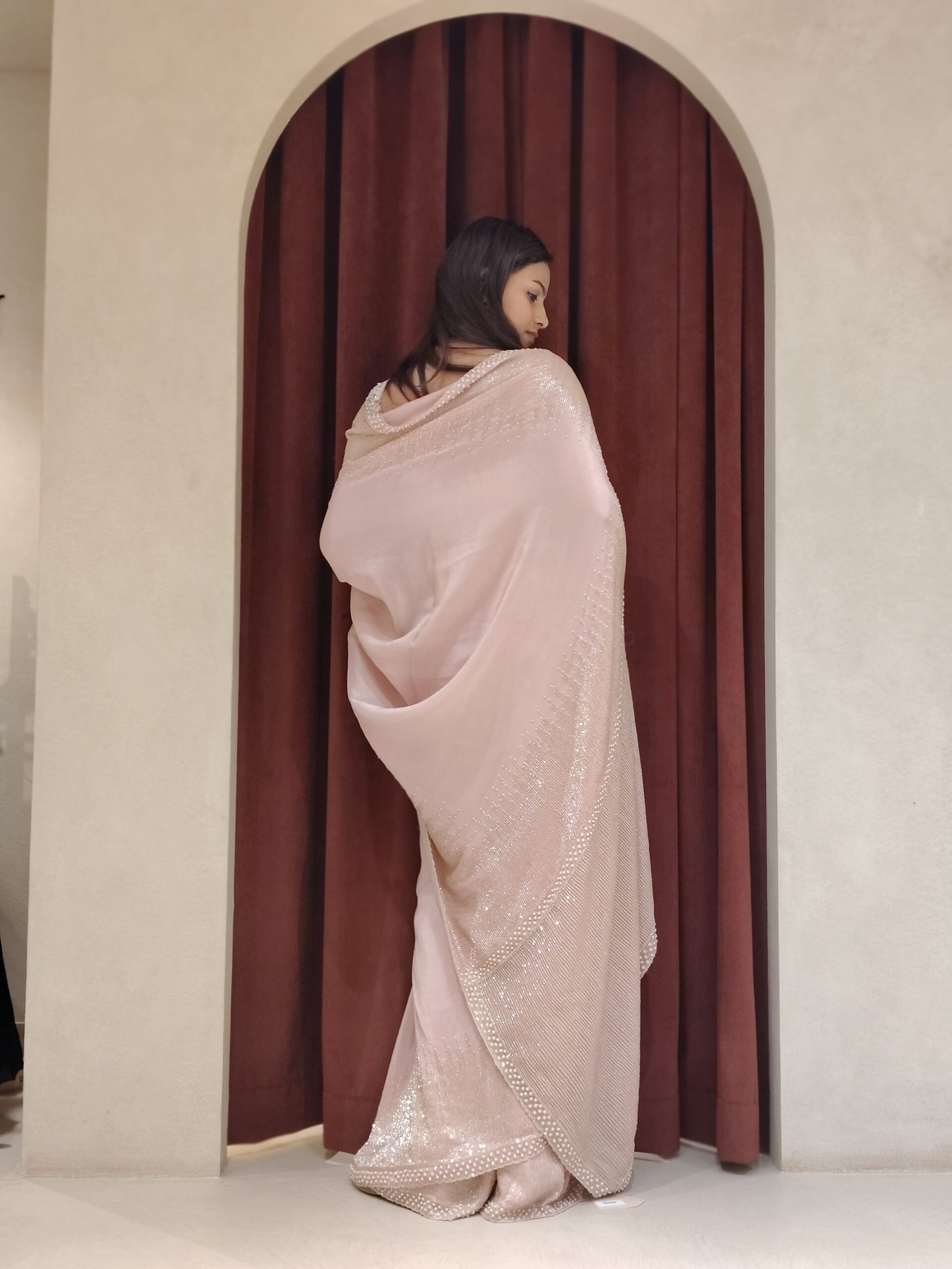 Draped in a dreamy baby pink hue, this exquisite saree is designed to embody pure elegance and celebration. Meticulously adorned with intricate pearl and cutdana handwork, every detail reflects refined craftsmanship and luxurious artistry. The delicate shimmer enhances the softness of the shade, creating a graceful glow that captures attention effortlessly.