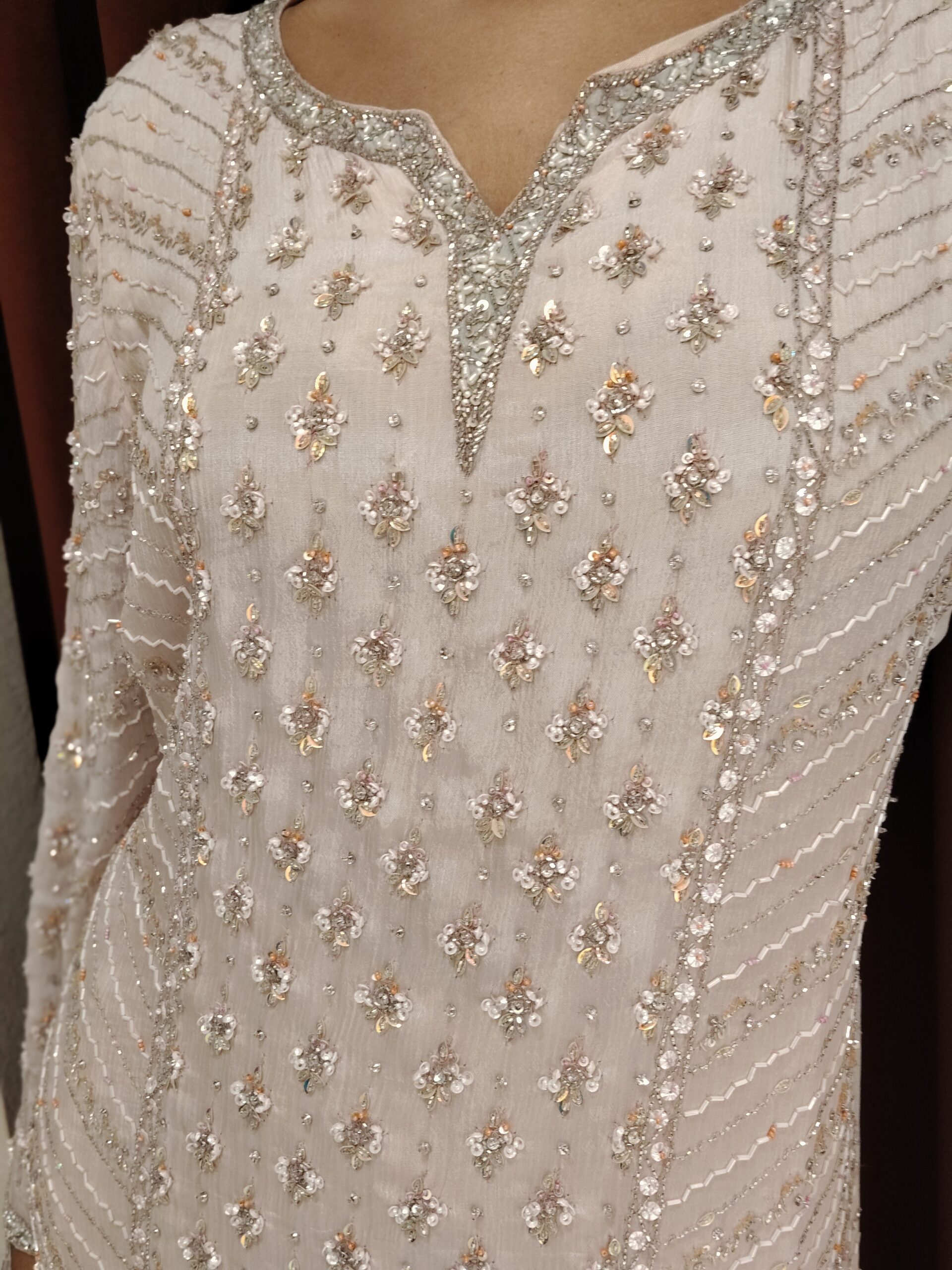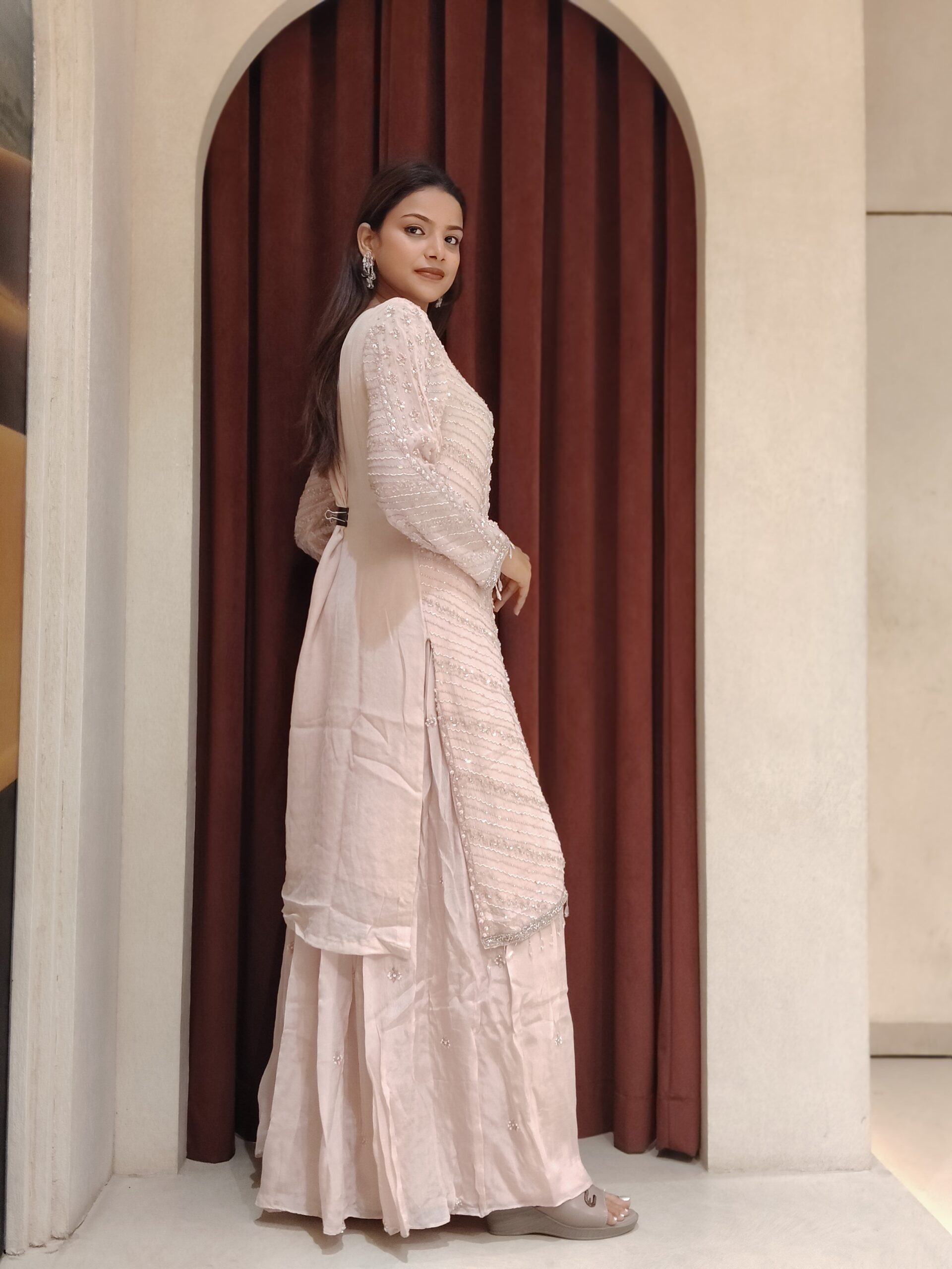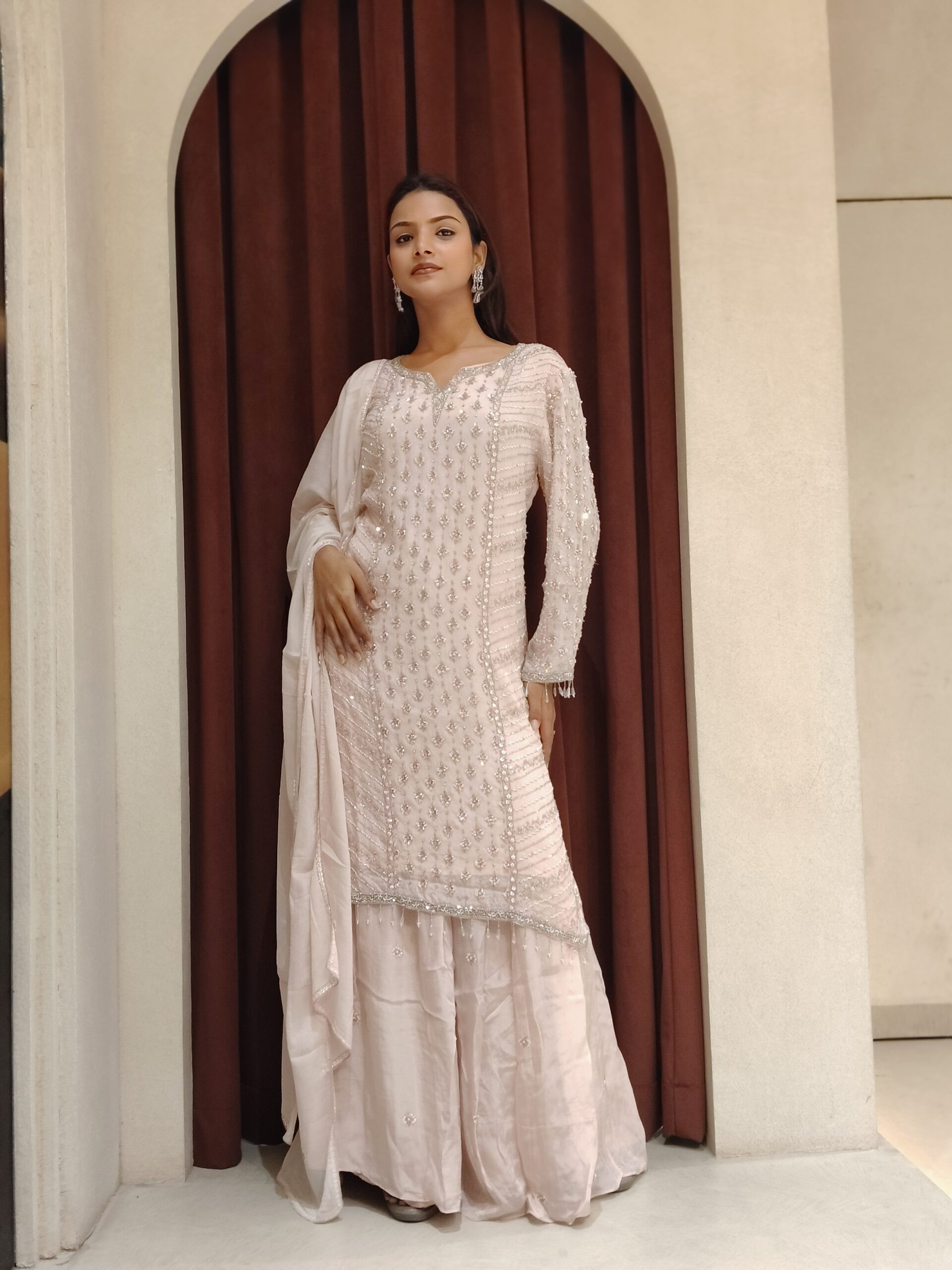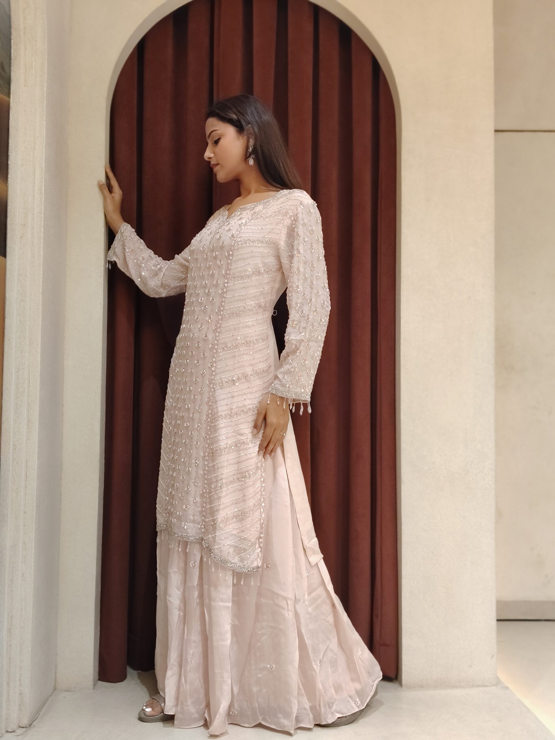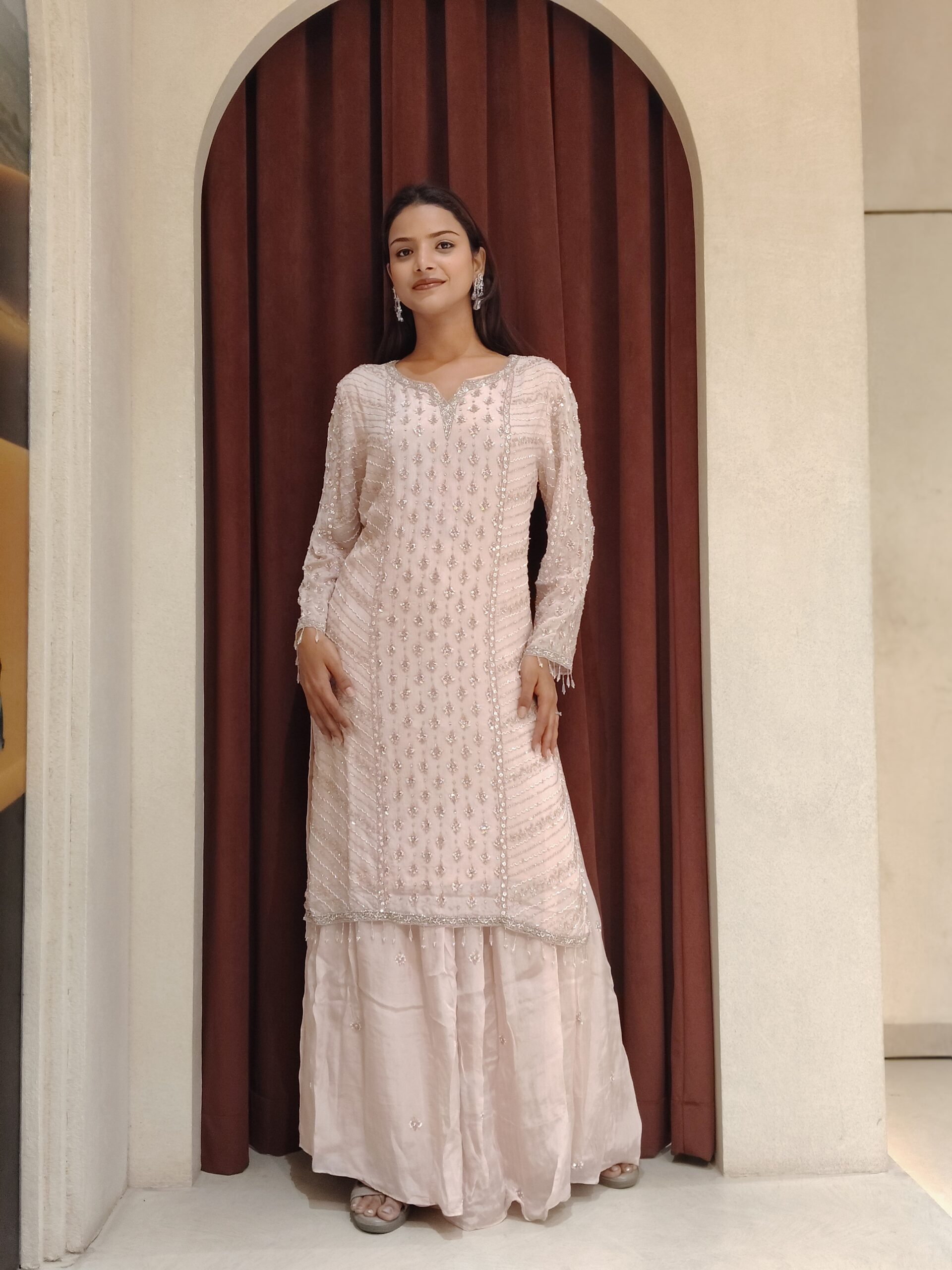 This enchanting blush-toned ensemble is a vision of understated luxury and refined charm. The straight-cut kurta is beautifully adorned with intricate handwork featuring delicate sequins and subtle embellishments arranged in elegant patterns, creating a soft shimmer with every movement. The finely detailed sleeves add a touch of sophistication, enhancing the graceful silhouette.
