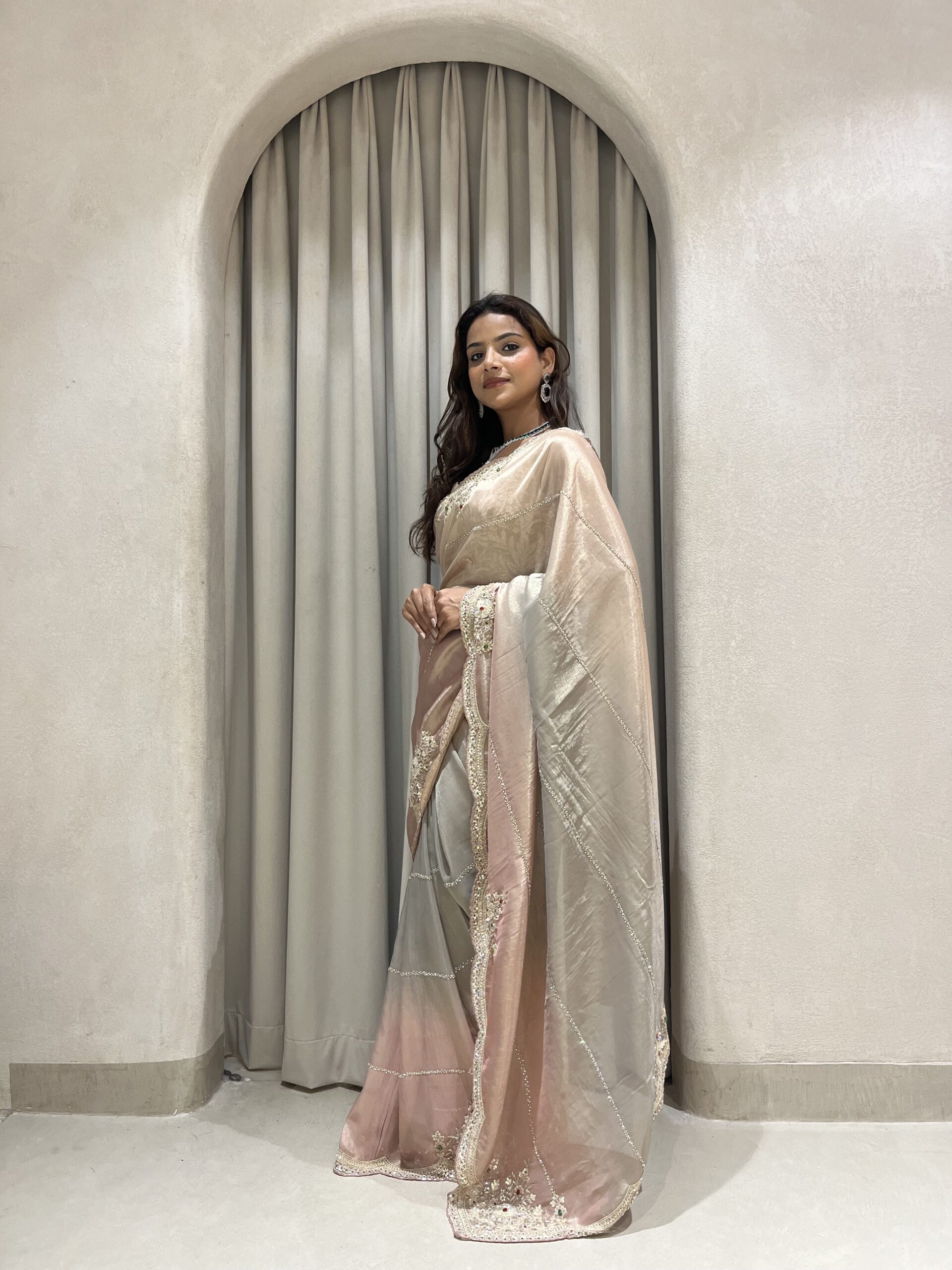 Perfect for cocktail evenings, festive celebrations, and grand parties, this statement piece embodies sophistication with a modern twist — designed for the woman who loves to shine with understated luxury.
