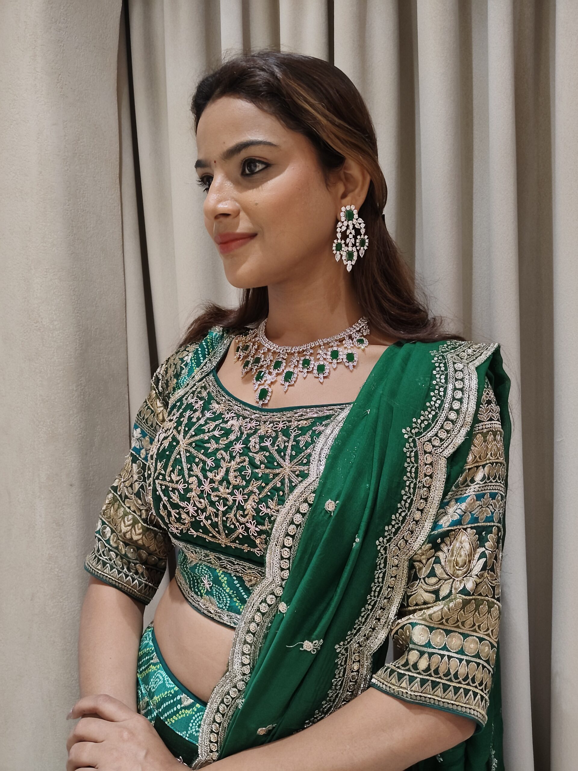 Emerald Green Georgette Bandhani Lehenga with Grand Embellished Blouse