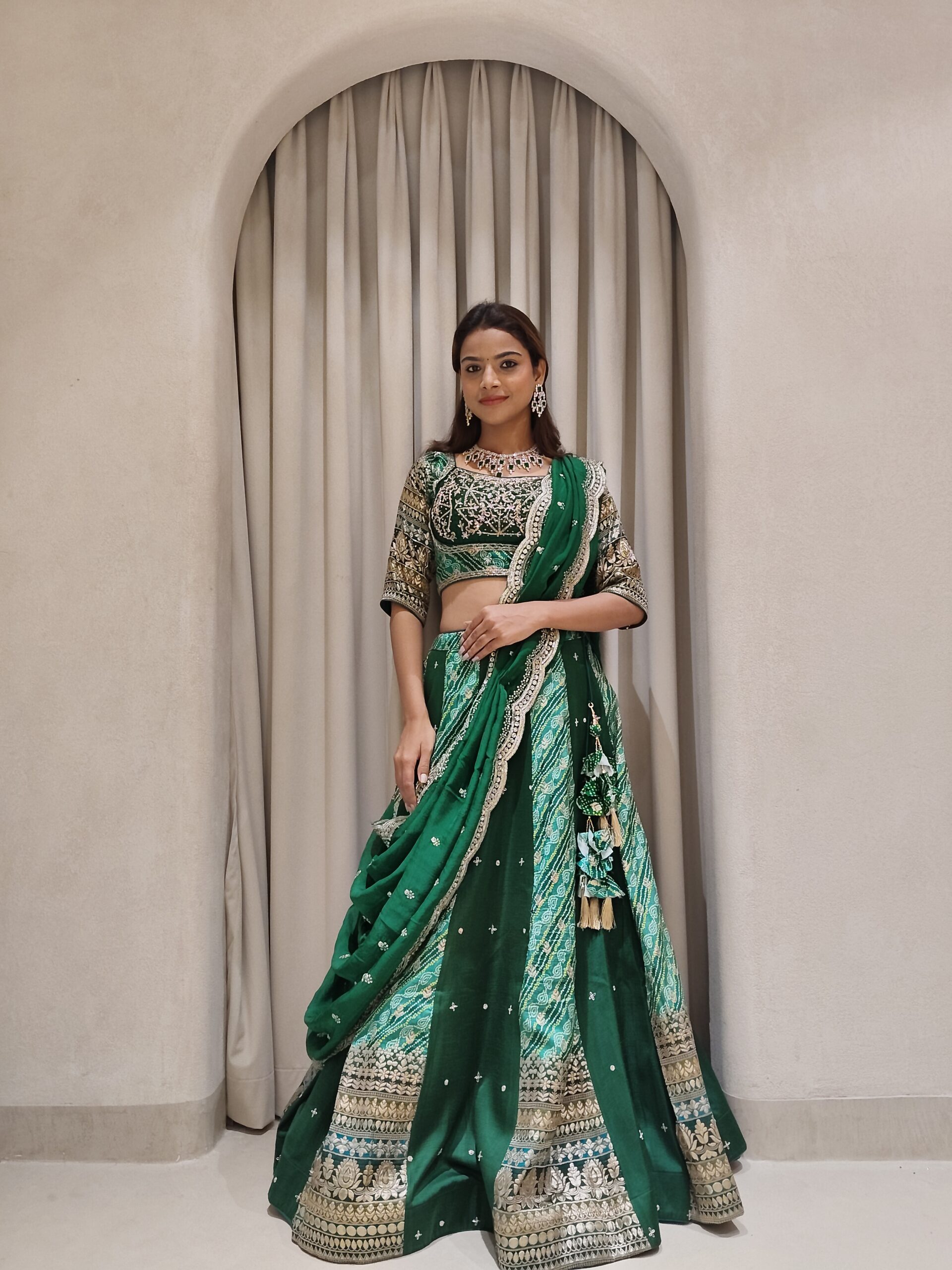 Immerse yourself in regal splendor with this breathtaking emerald green lehenga crafted in luxuriously fluid georgette. The timeless beauty of traditional bandhani artistry graces the lehenga, creating a harmonious blend of heritage and haute couture. Its graceful drape and rich hue exude understated opulence, making every movement a vision of elegance.