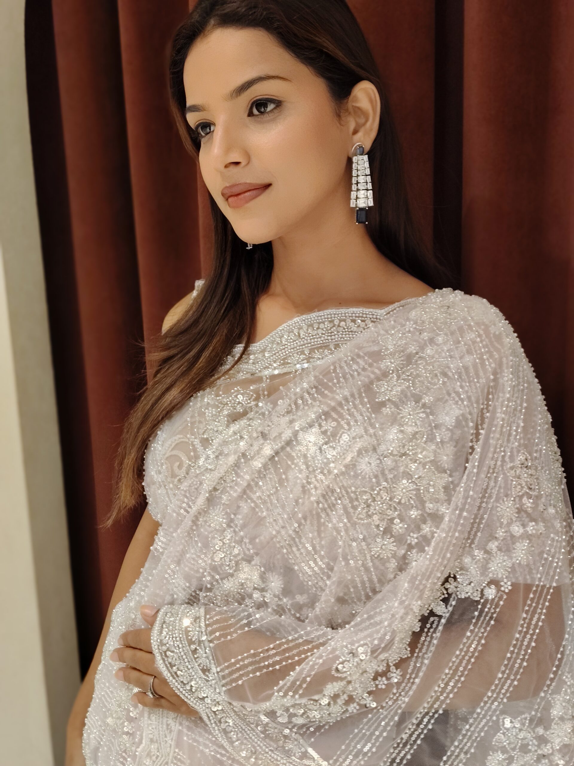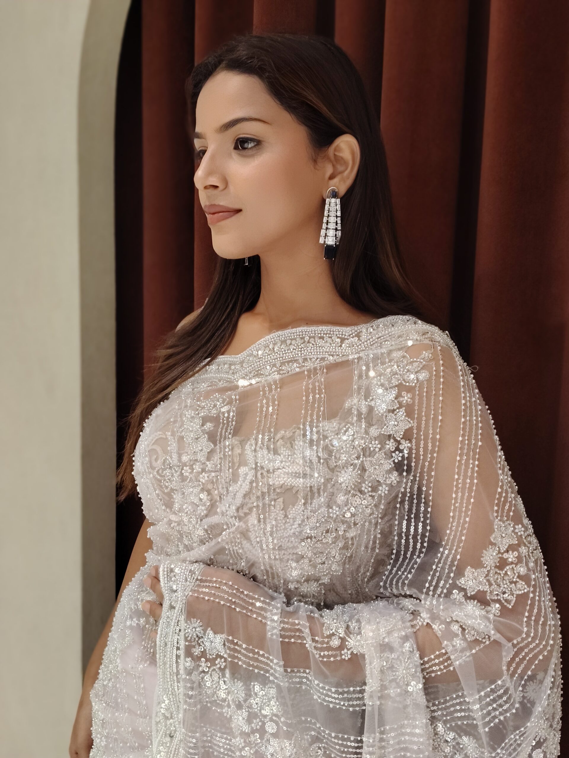 Indulge in timeless elegance with this ethereal pale pink net saree, exquisitely adorned with delicate pearl embellishments, shimmering sequins, and intricate handwork. The soft blush hue radiates grace, while the refined craftsmanship creates a mesmerizing play of light with every movement. Designed for the woman who loves understated luxury, this masterpiece drapes effortlessly, enhancing your silhouette with sophistication and charm.