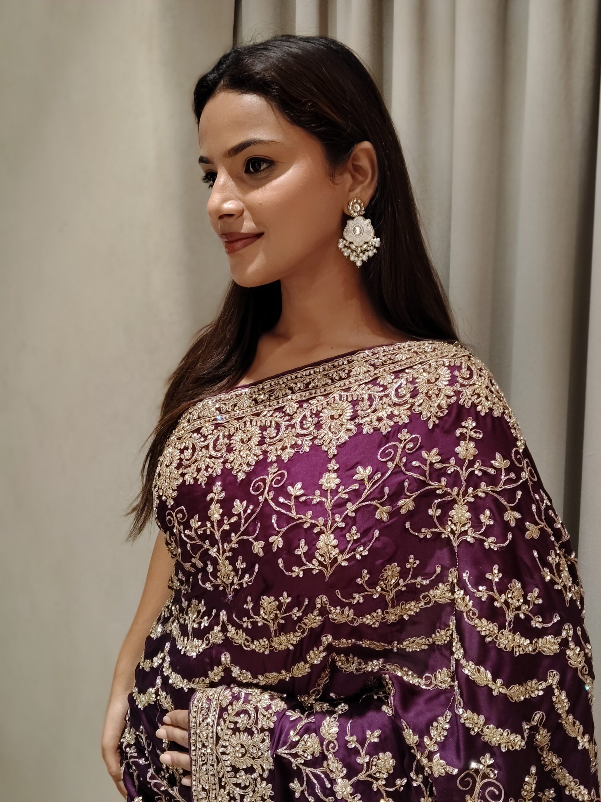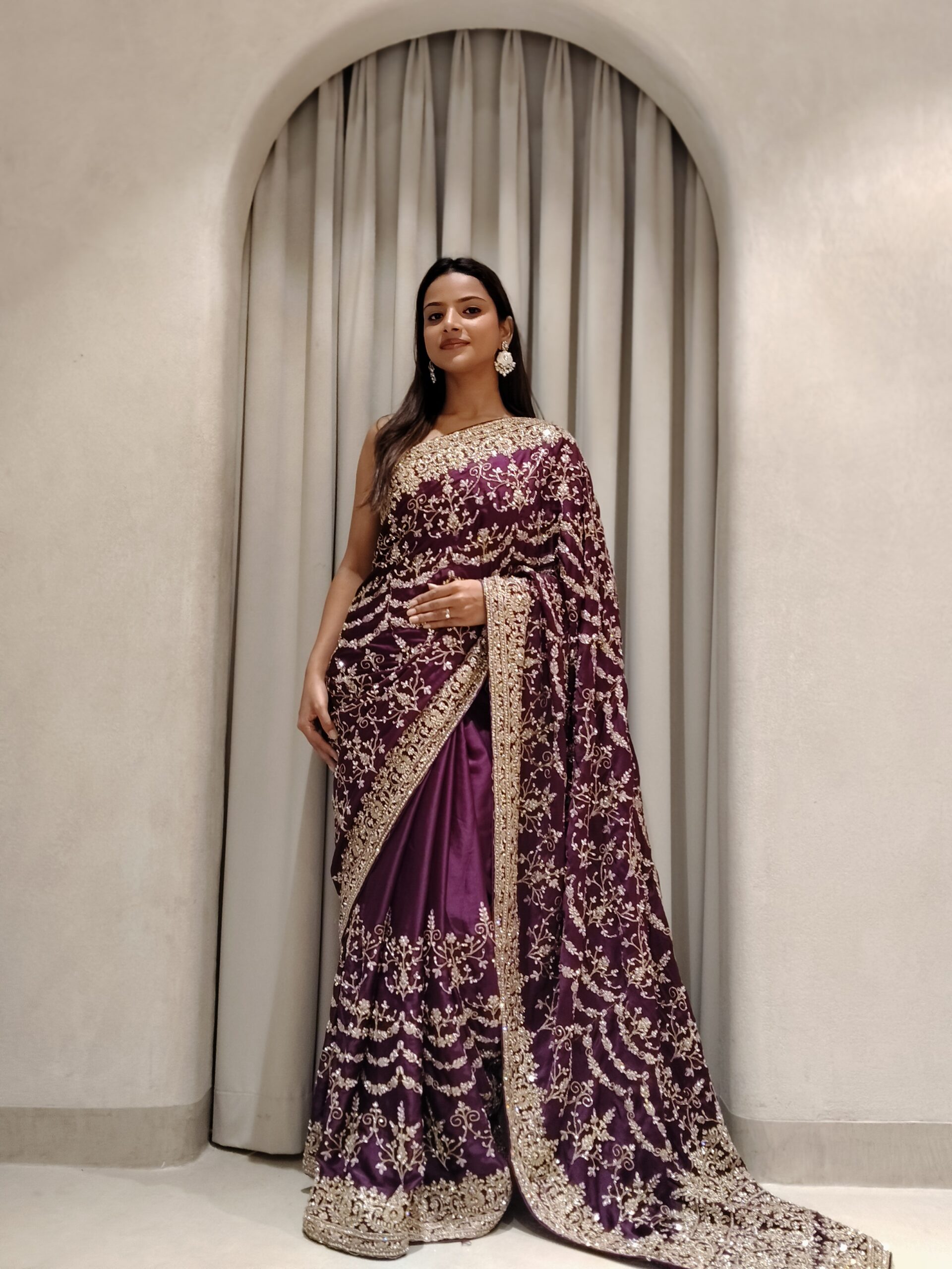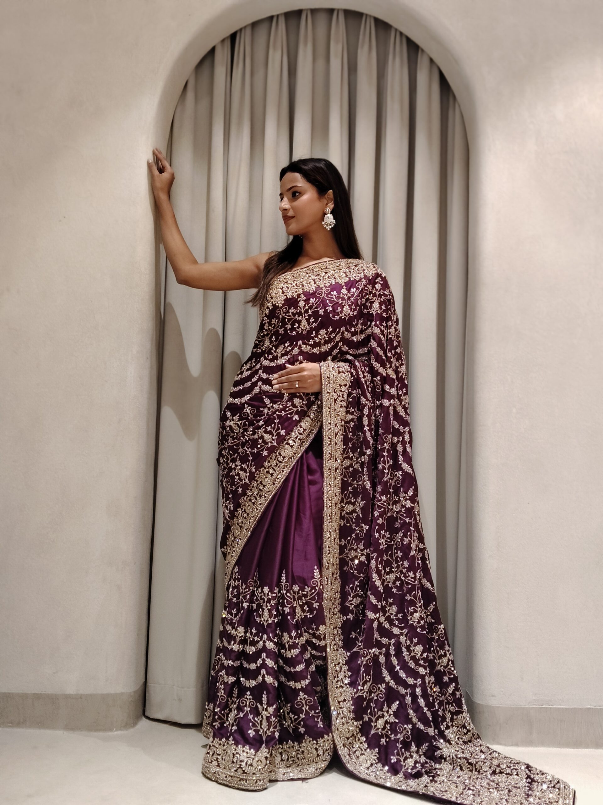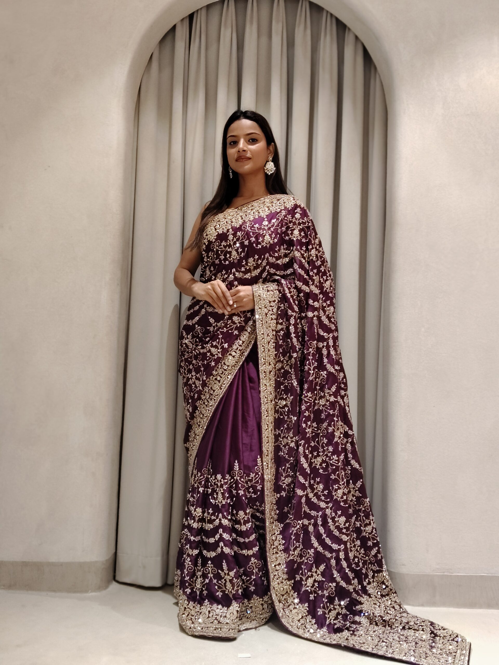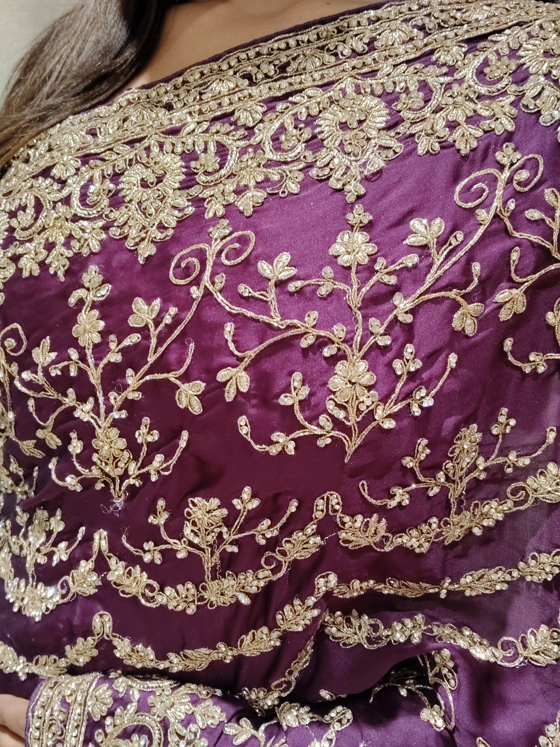 Immerse yourself in timeless elegance with this regal plum saree, exquisitely crafted to embody grace and grandeur. The rich, jewel-toned base is beautifully adorned with intricate gold zari embroidery, forming delicate vine and floral motifs that cascade effortlessly across the drape.