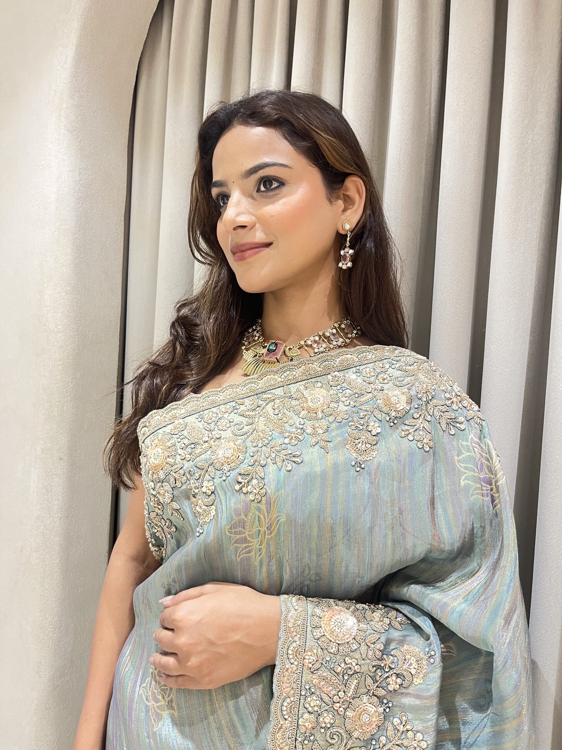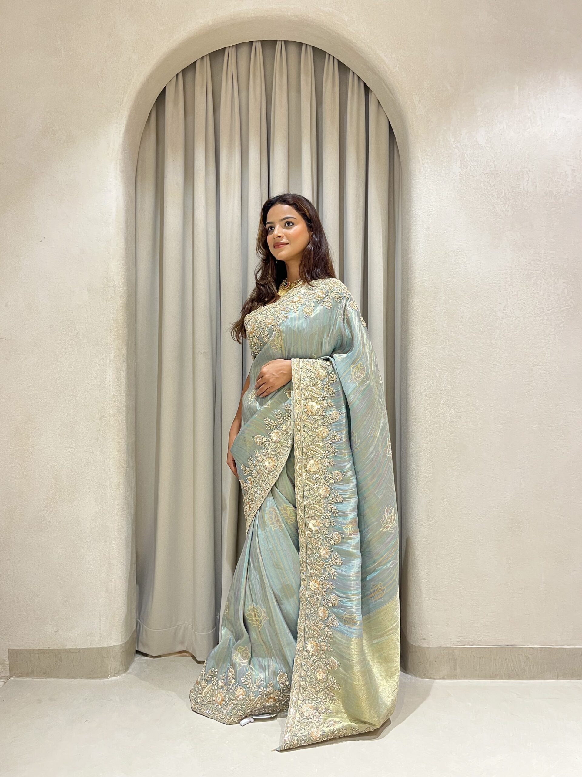 An opulent Banarasi saree adorned with rich zari, intricate thread, stone, and sequin border work.