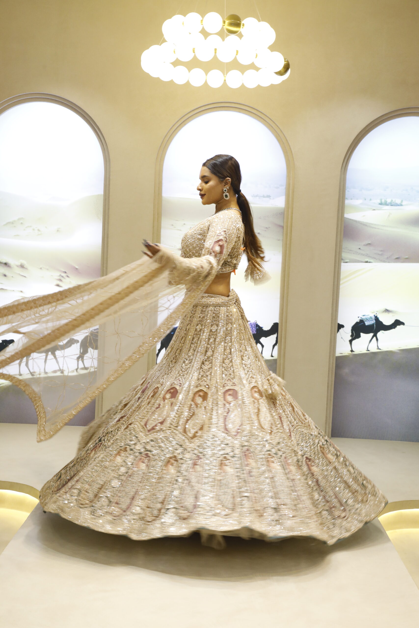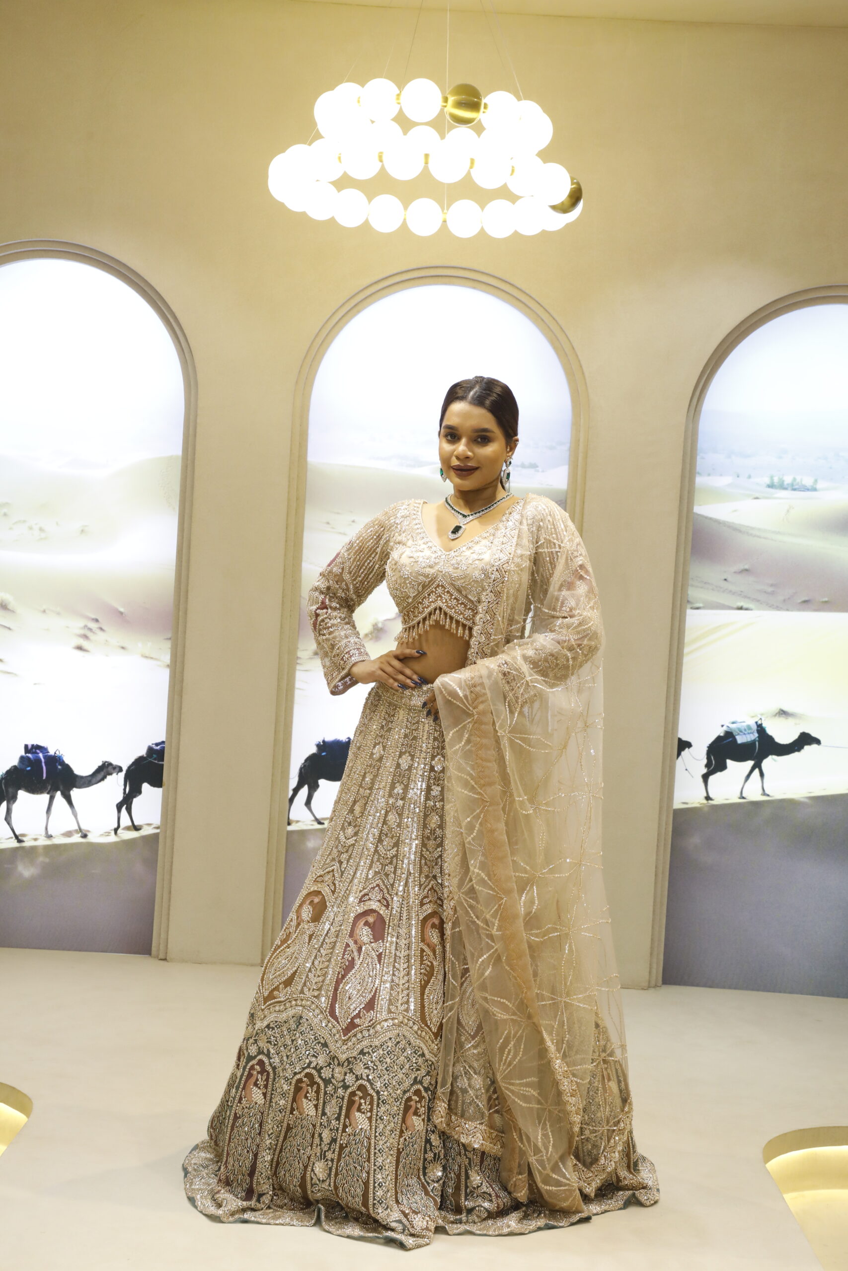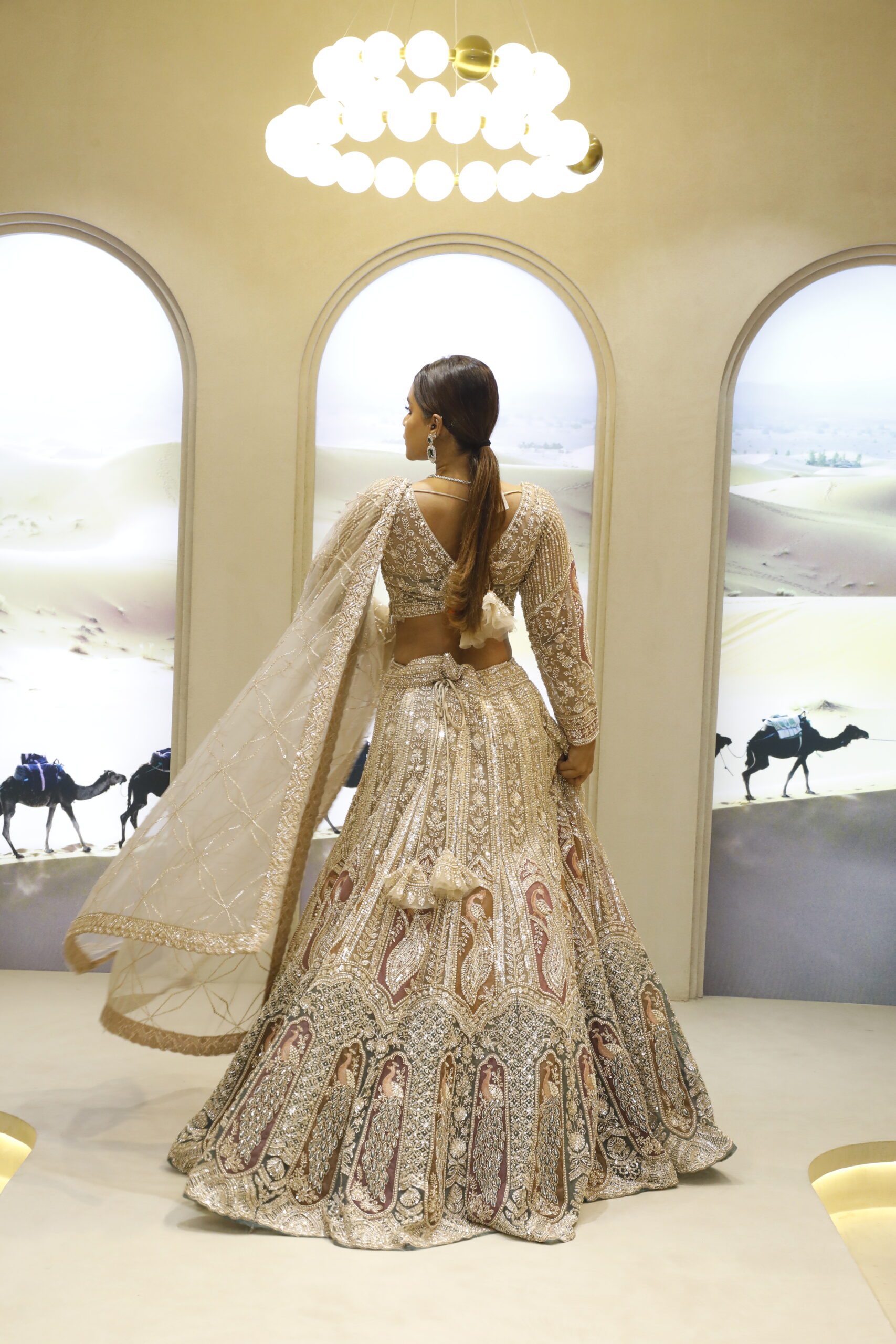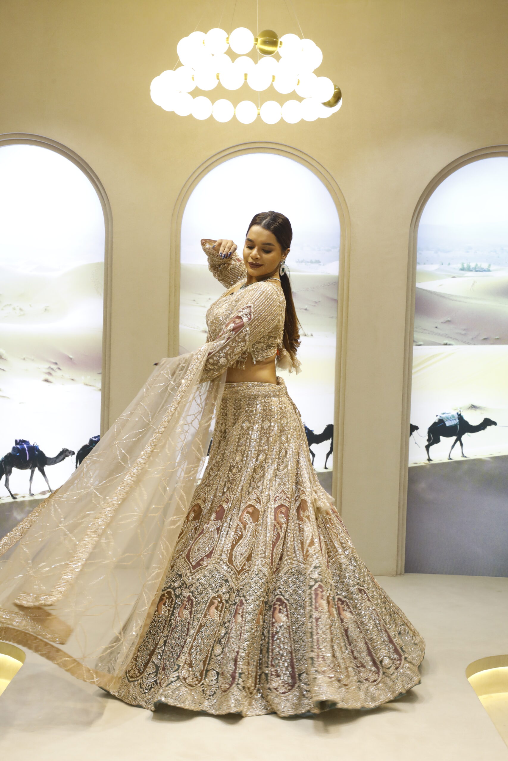 Drape yourself in sheer opulence with this exquisite lite gold lehenga, masterfully adorned with shimmering stones, sequins, delicate beads, and intricate cutdana work. The majestic peacock design, symbolizing grace and royalty, is beautifully highlighted through meticulous hand-embellishment, creating a mesmerizing play of texture and sparkle. Every detail reflects timeless craftsmanship and grandeur, making this lehenga a statement of refined elegance.