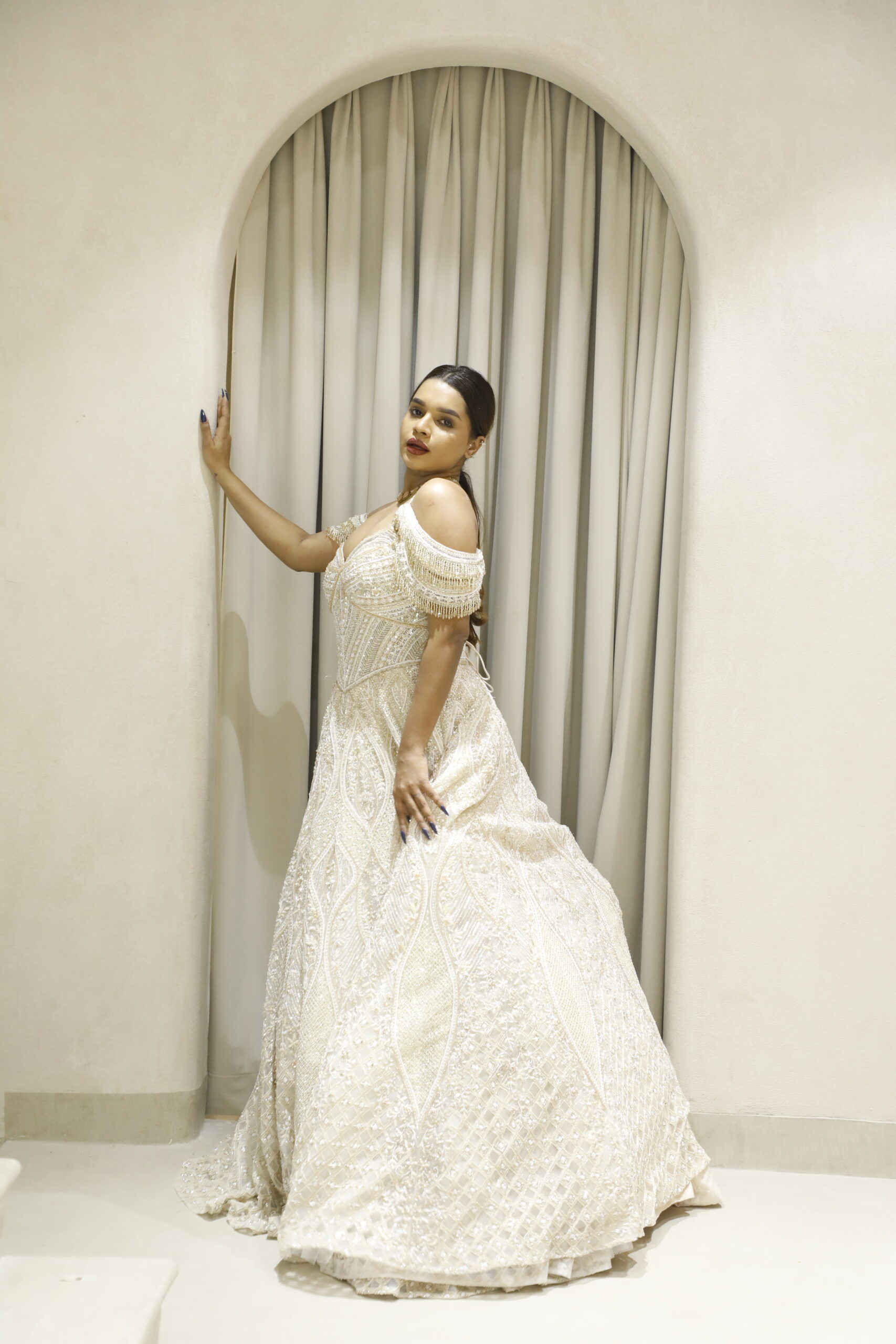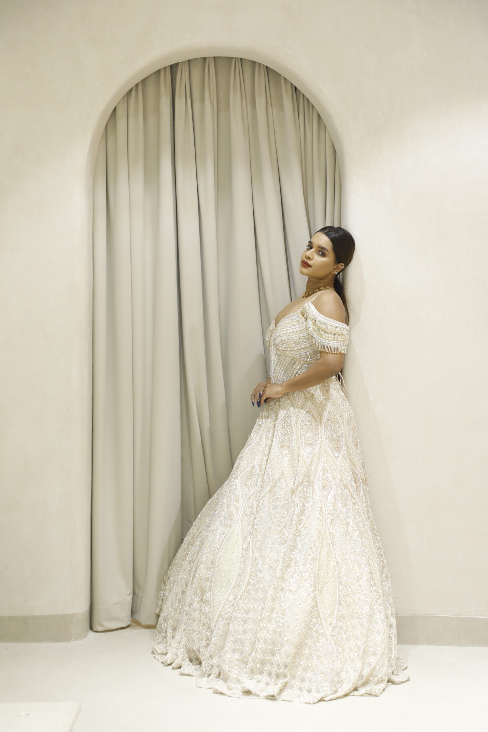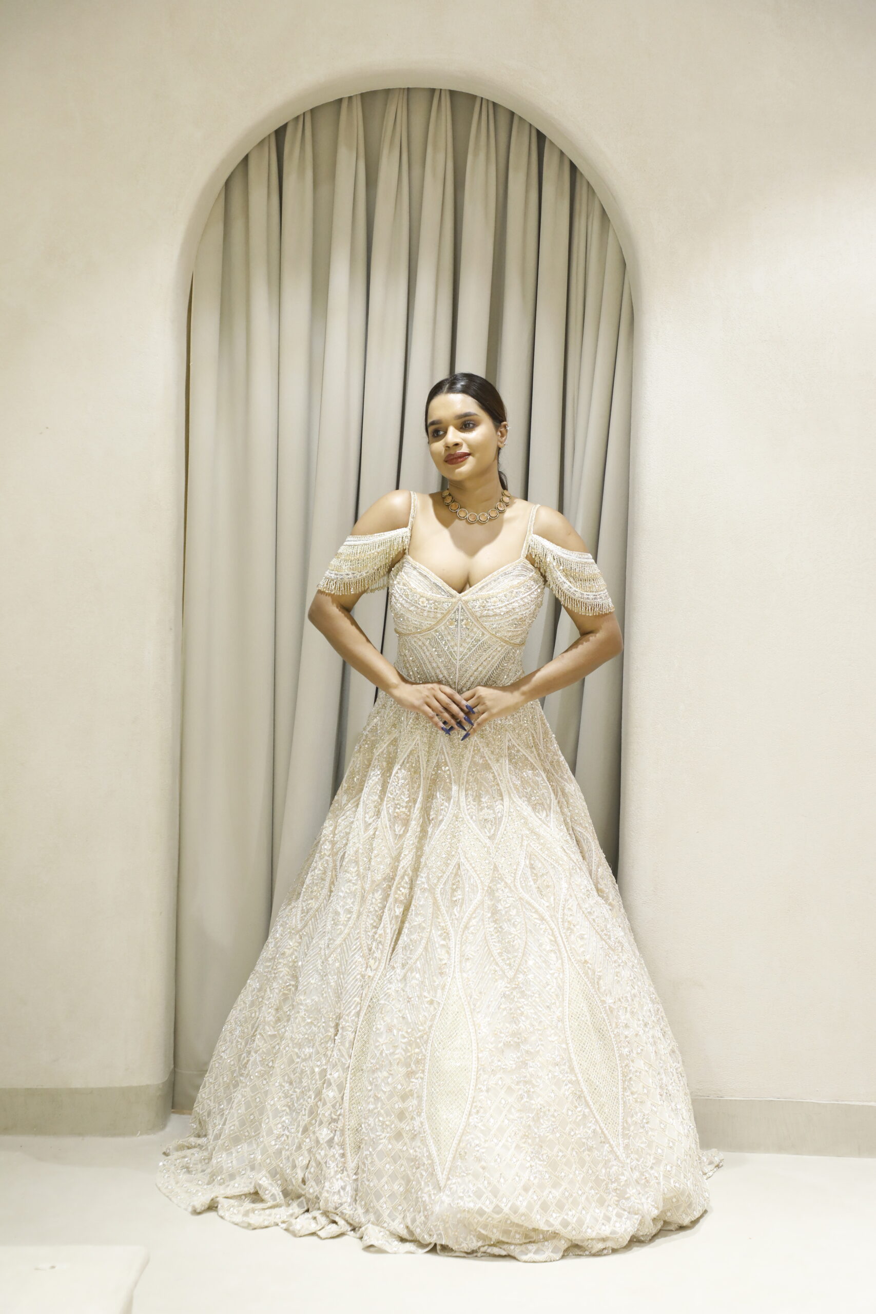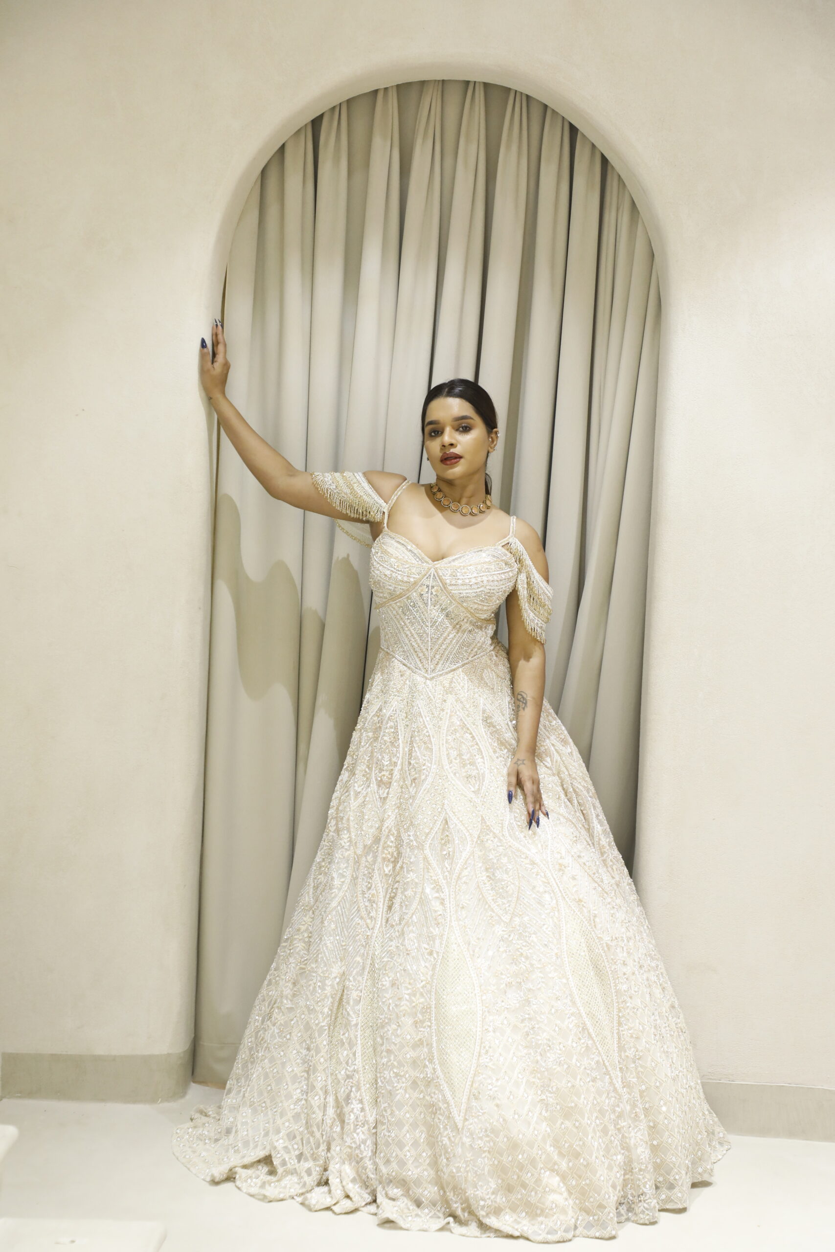 Designed with a statement cold-shoulder silhouette and accentuated with dramatic heavy tassels, this gown strikes the perfect balance between sophistication and modern glamour. A flawless choice for receptions, cocktail evenings, or grand celebrations, this creation promises to leave a lasting impression with every step you take.