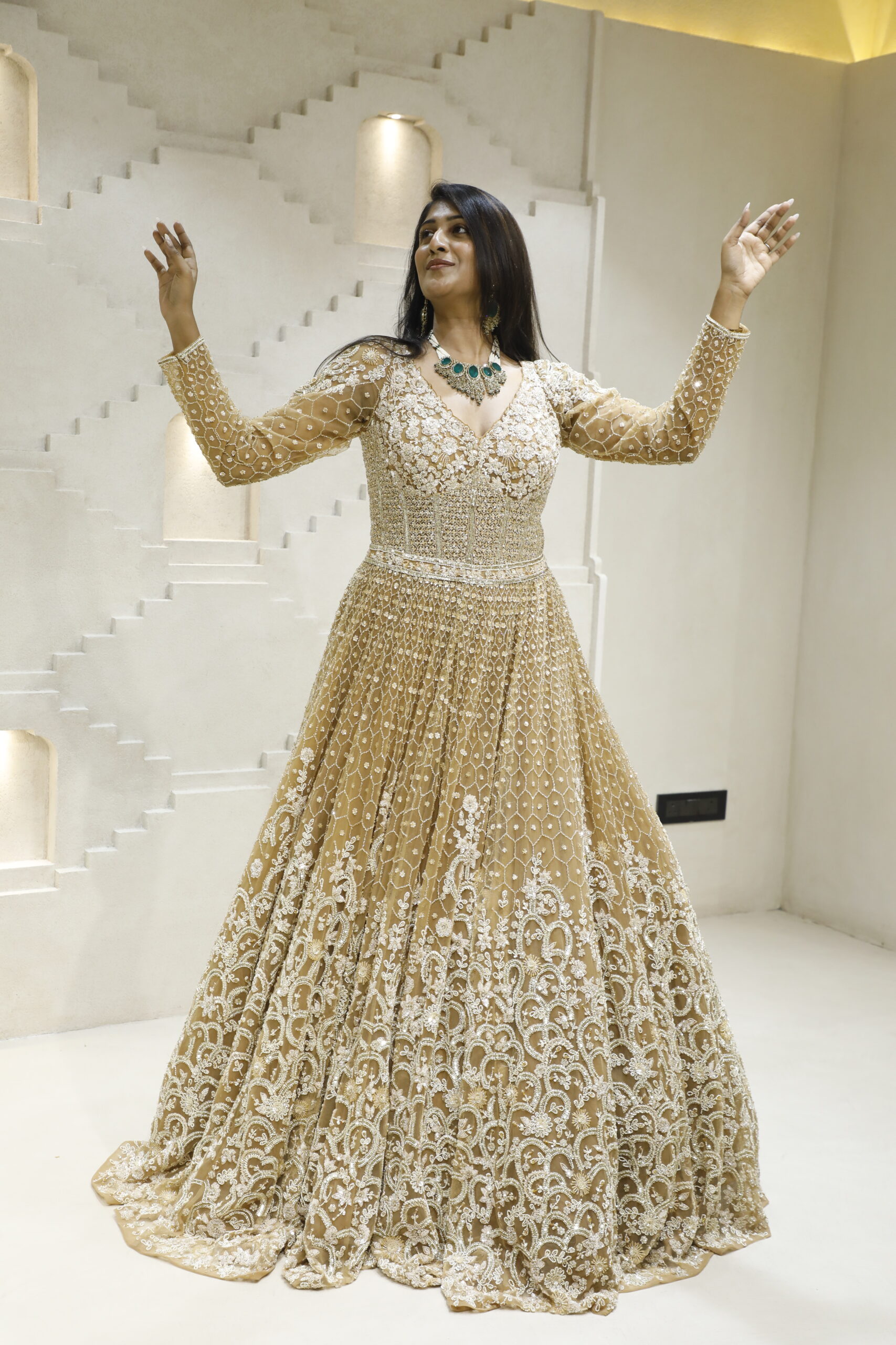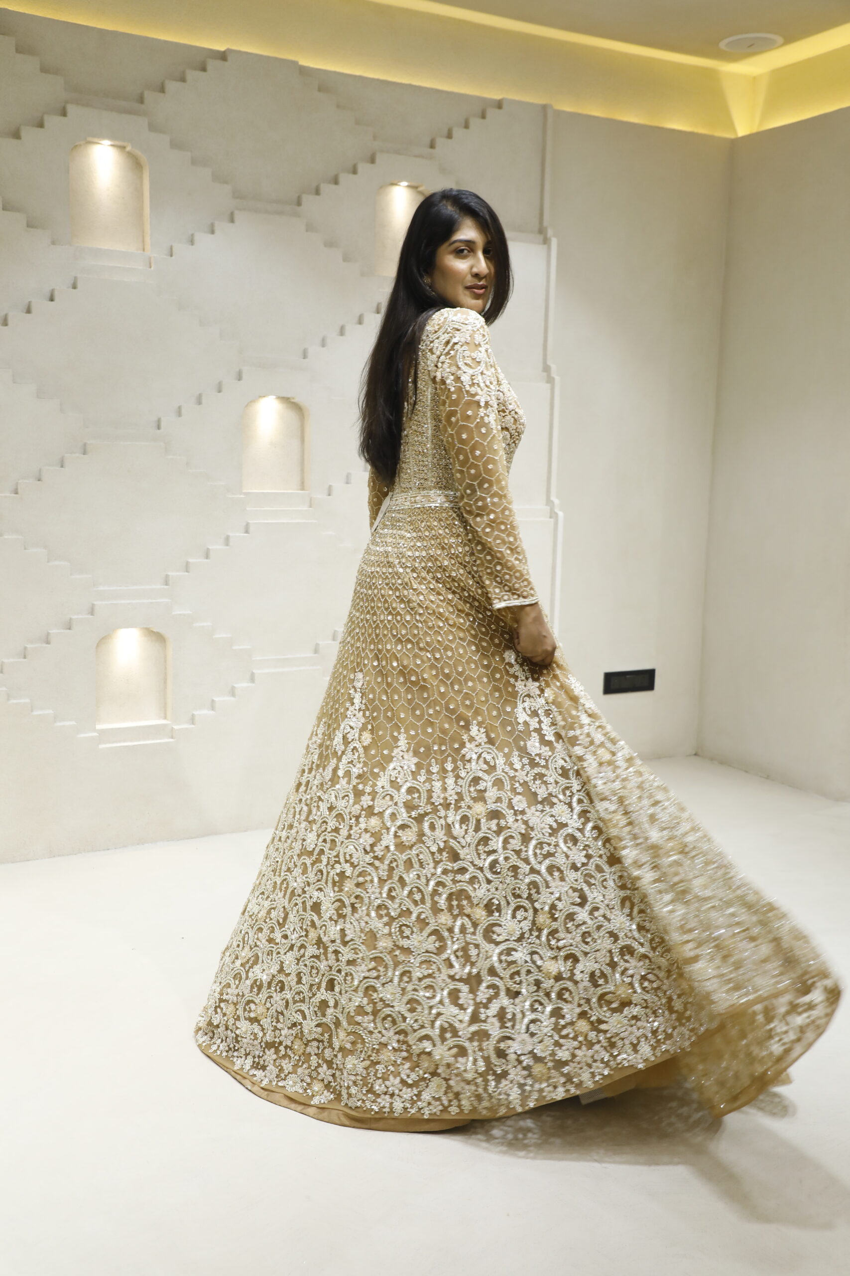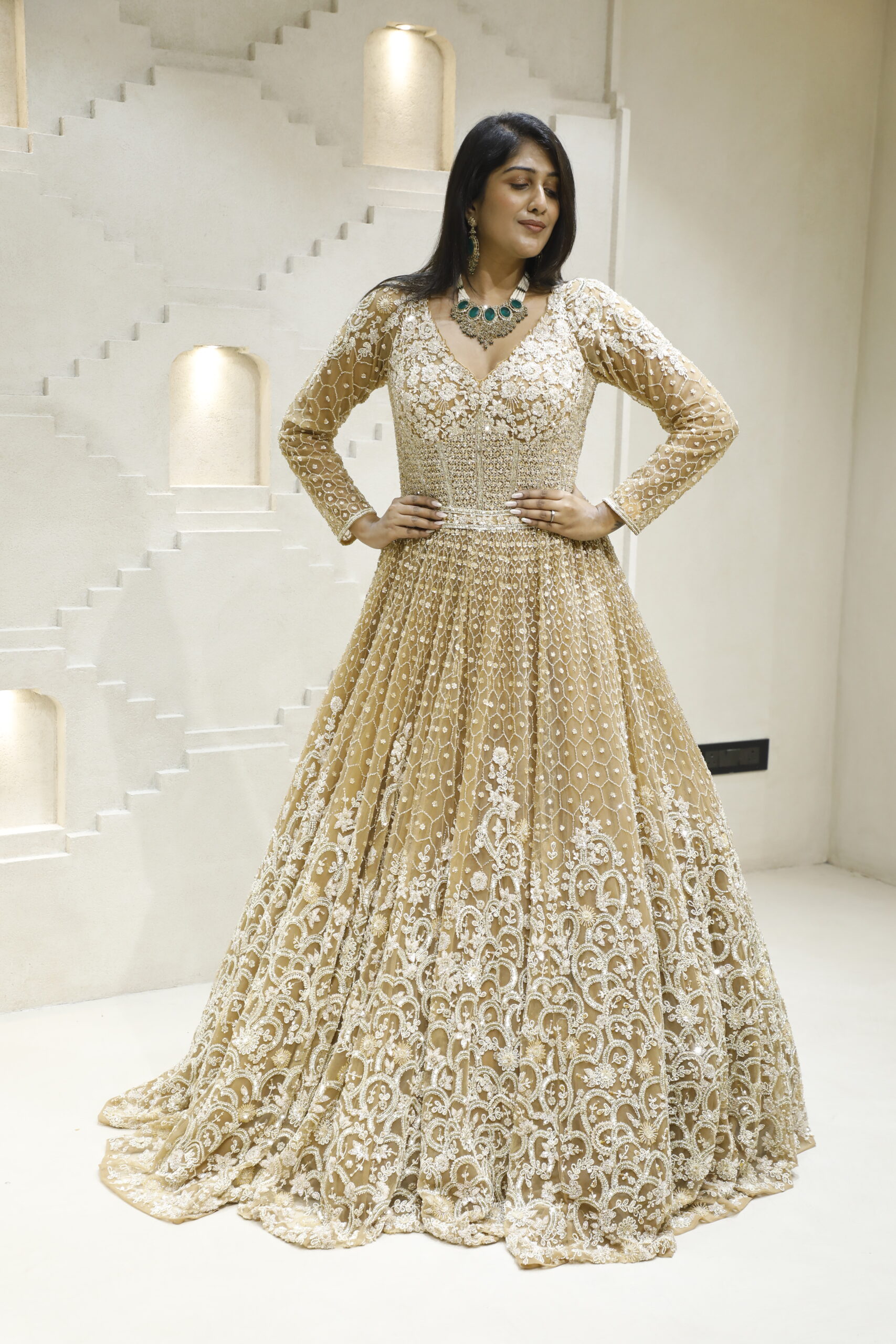 Immerse yourself in opulence with this Dark Gold Bridal Gown, a radiant masterpiece crafted for the bride who desires timeless grandeur. Adorned with exquisite hand embroidery of cutdana, shimmering sequins, delicate pearls, and finely placed stones, every detail reflects artisanal perfection. The rich dark gold hue exudes royal elegance, while the intricate embellishments catch the light beautifully, creating a captivating glow with every step.