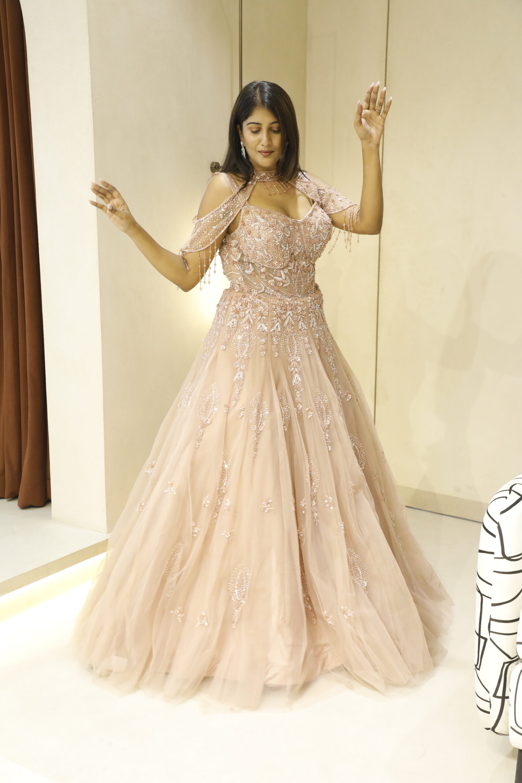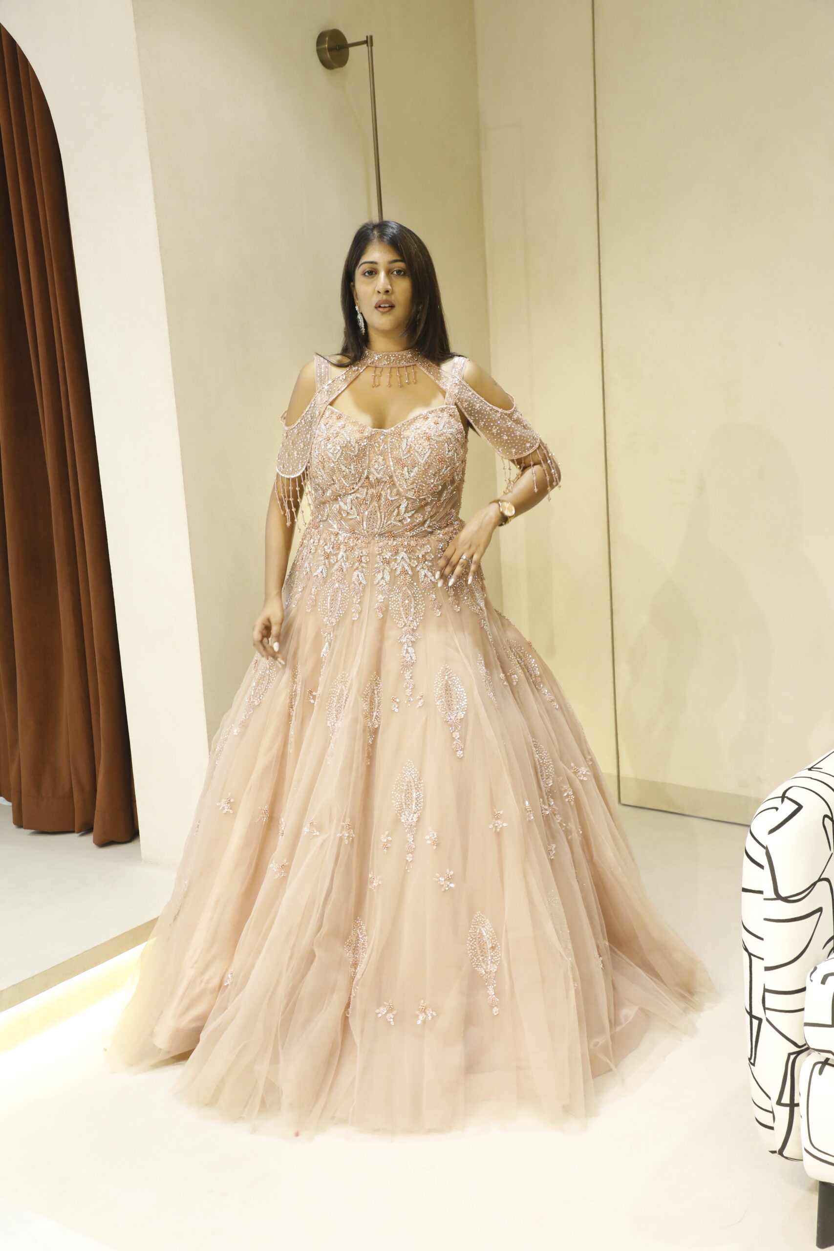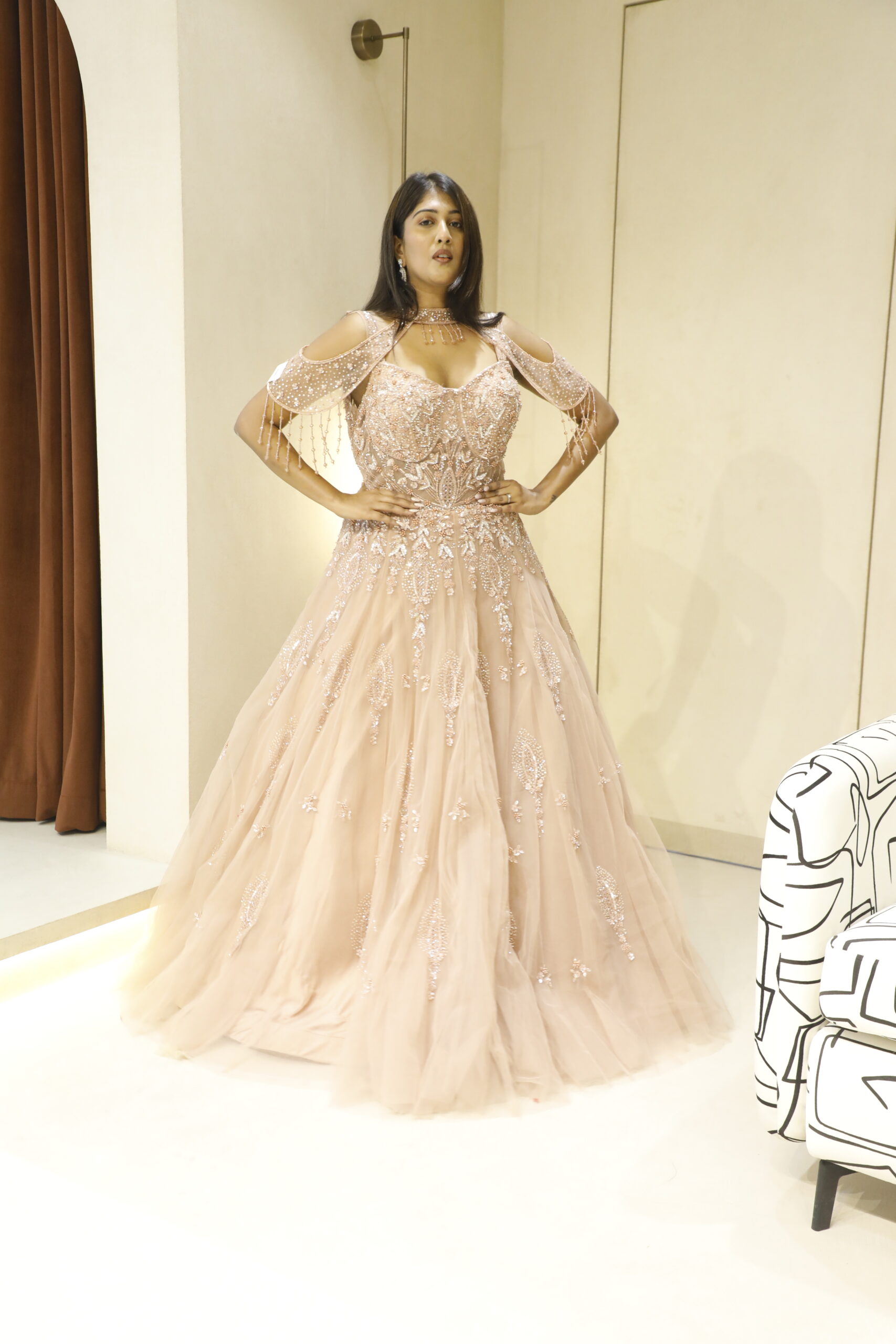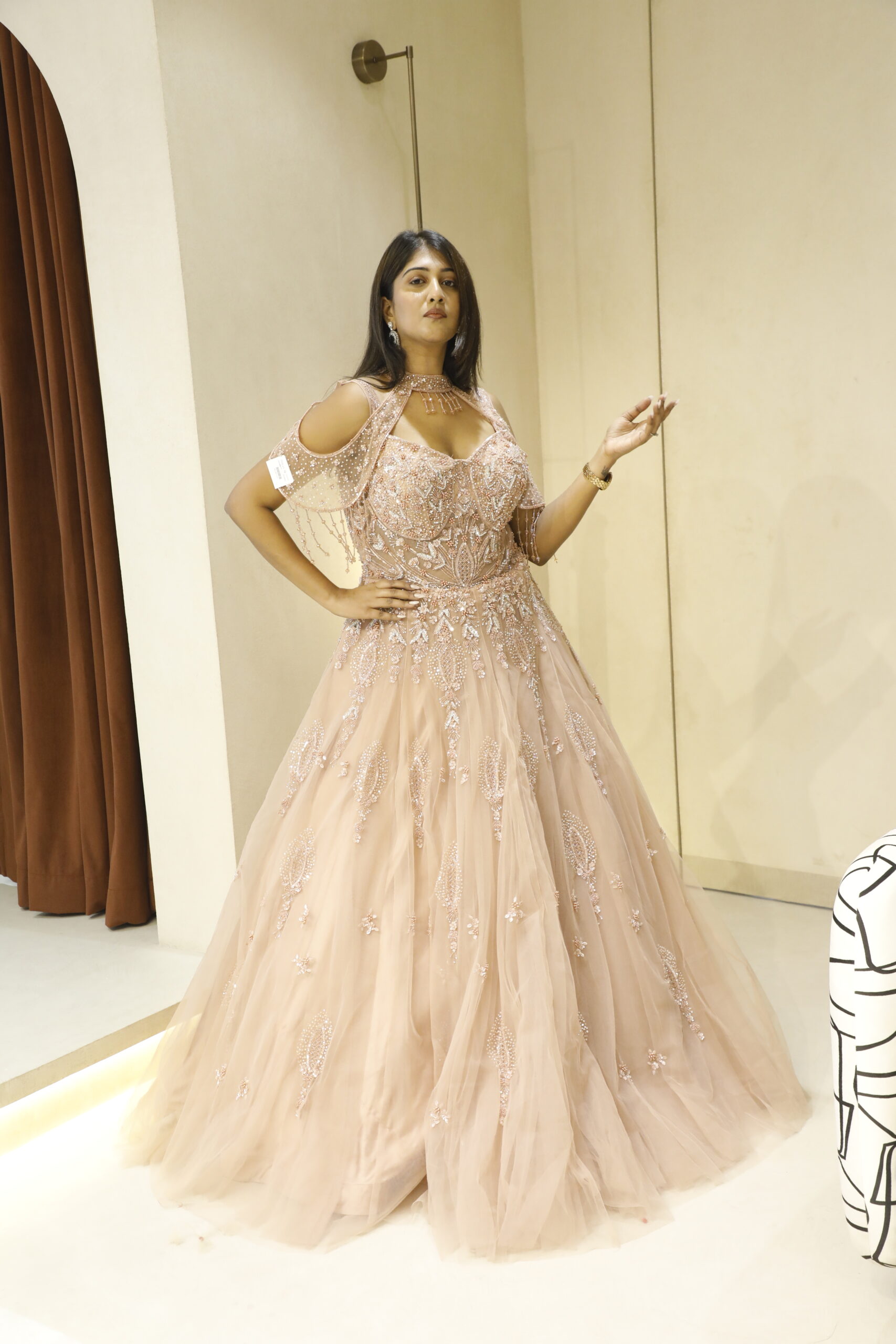 Designed with a statement cold-shoulder silhouette, it is beautifully accentuated with dramatic heavy tassels that add a touch of contemporary glamour to its timeless elegance. The flawless craftsmanship and refined detailing make this gown a perfect choice for receptions, cocktail evenings, and grand celebrations where making an impression is effortless.